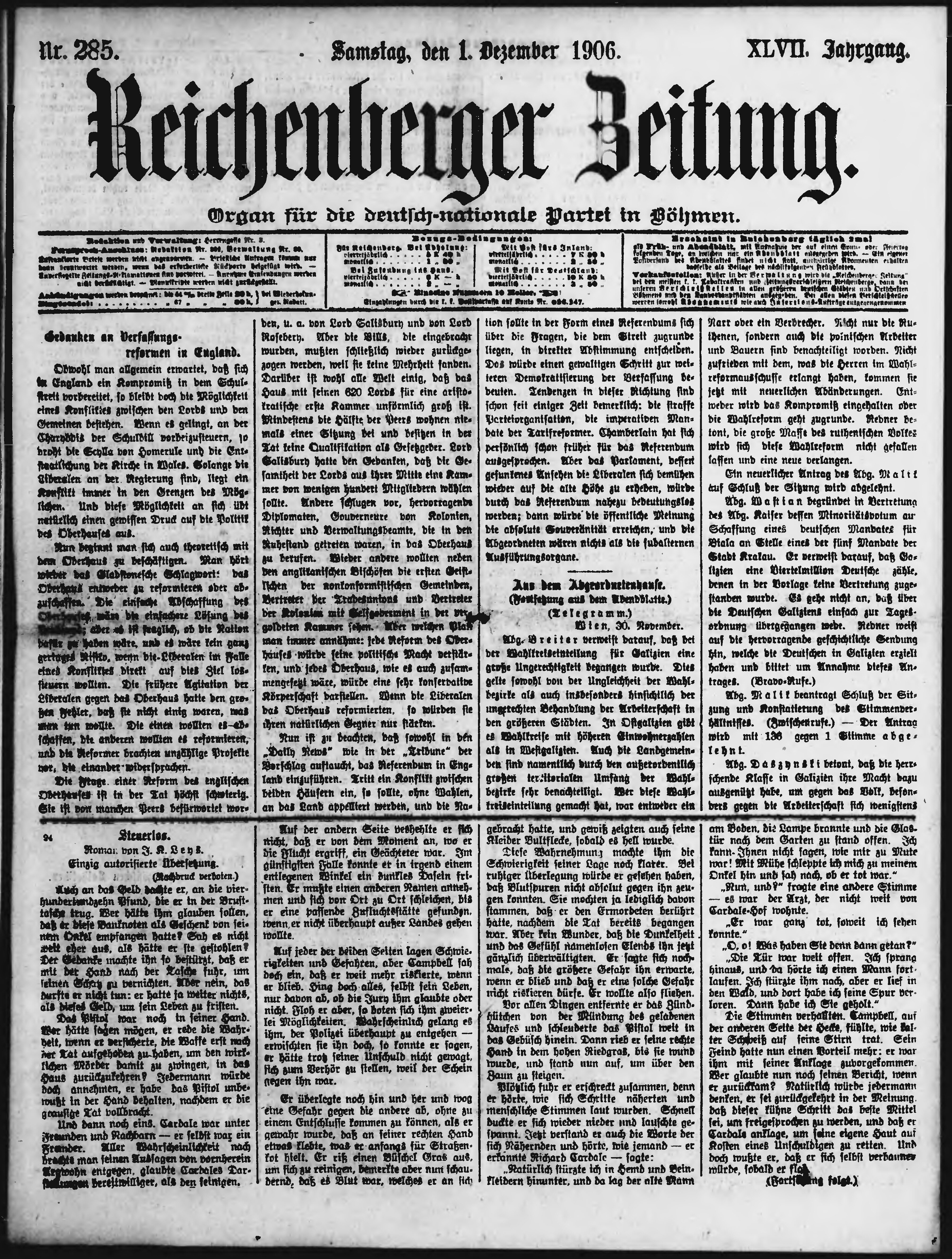 * Datum vydání výtisku: 1.12.1906 Číslo výtisku: 285 Poznámky k výtisku: ranní vydání;