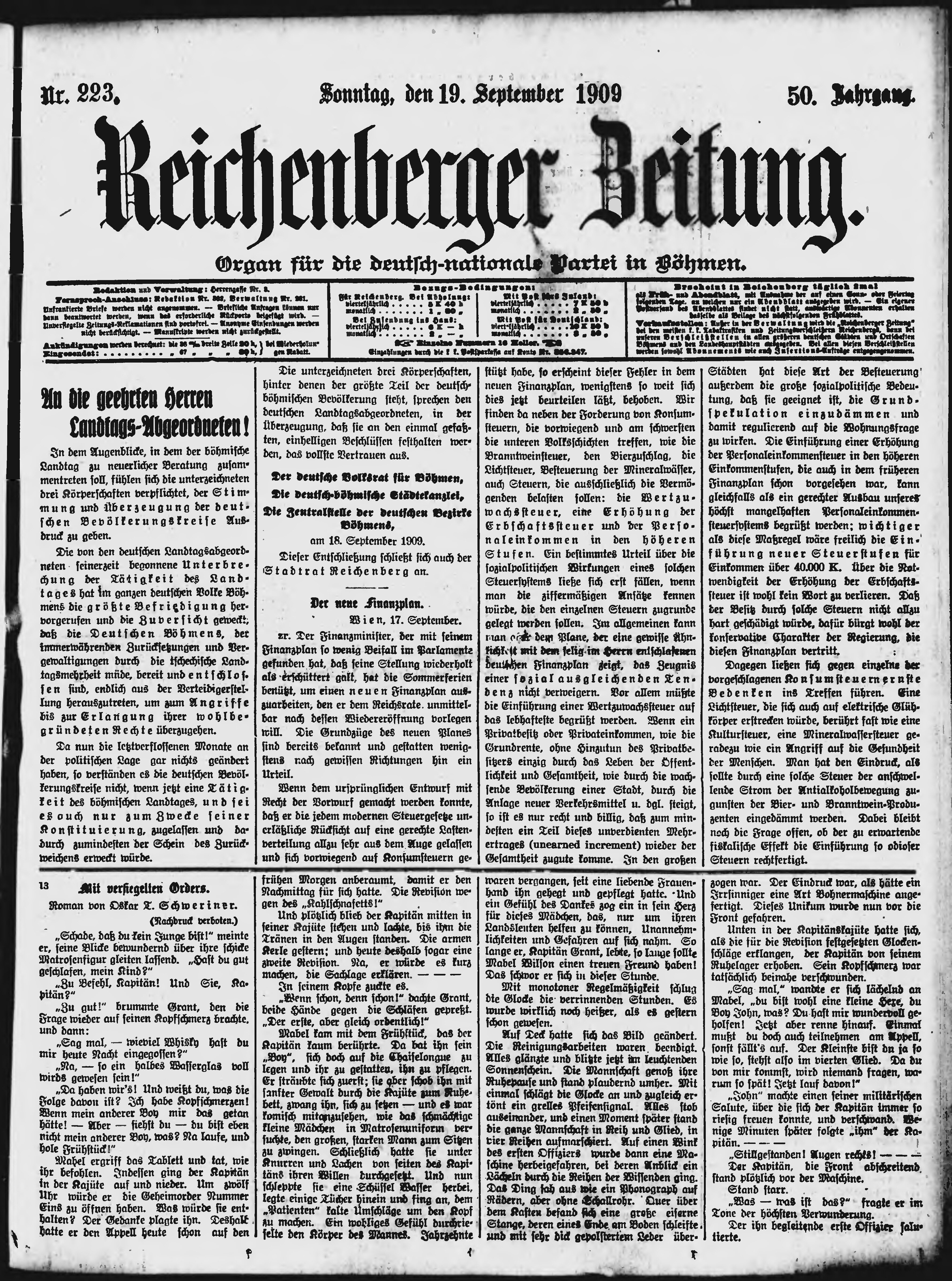 * Datum vydání výtisku: 19.9.1909 Číslo výtisku: 223 Poznámky k výtisku: s. 20 - 21 není k dispozici;