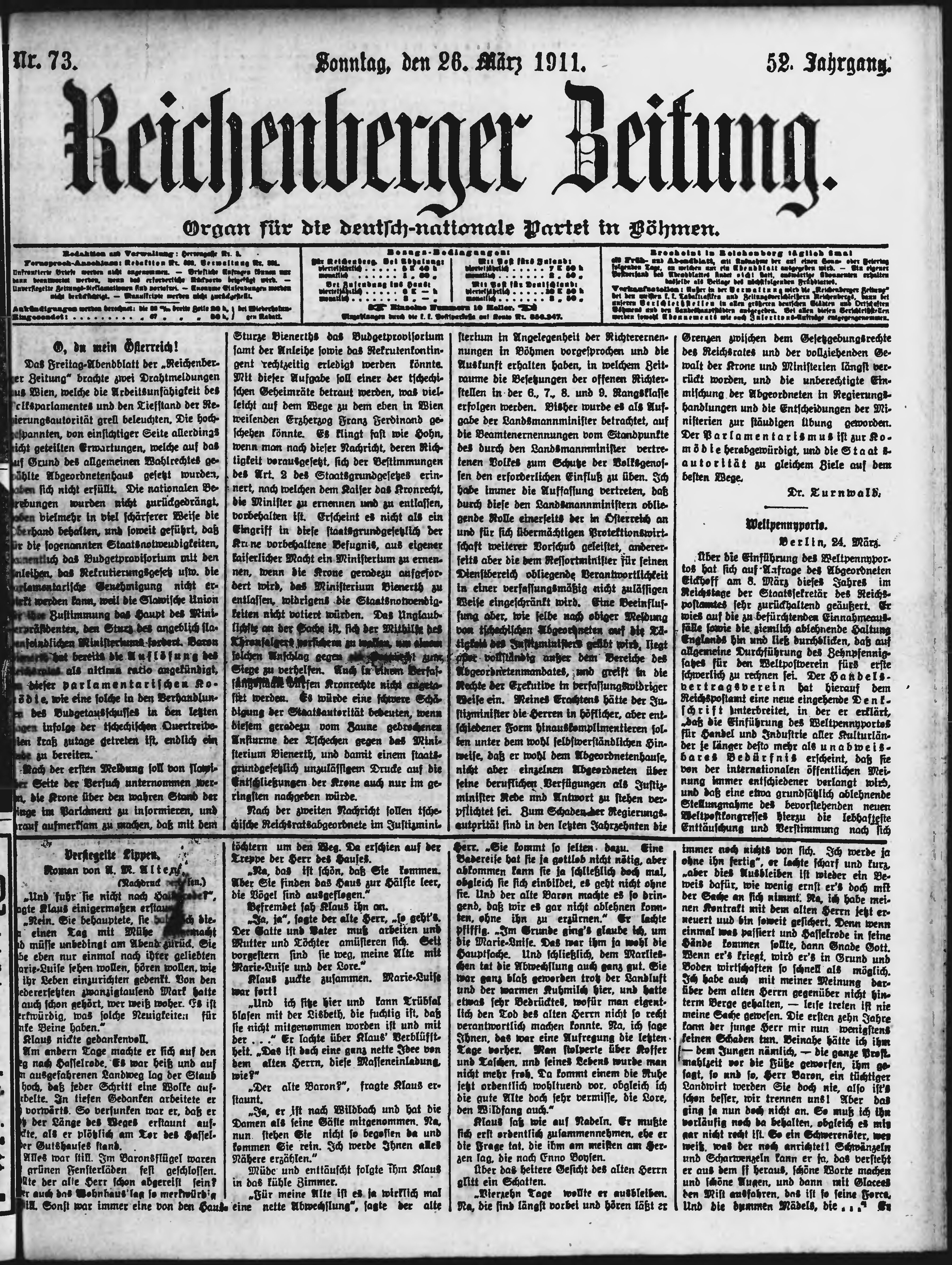 * Datum vydání výtisku: 26.3.1911 Číslo výtisku: 73 Poznámky k výtisku: ranní vydání;