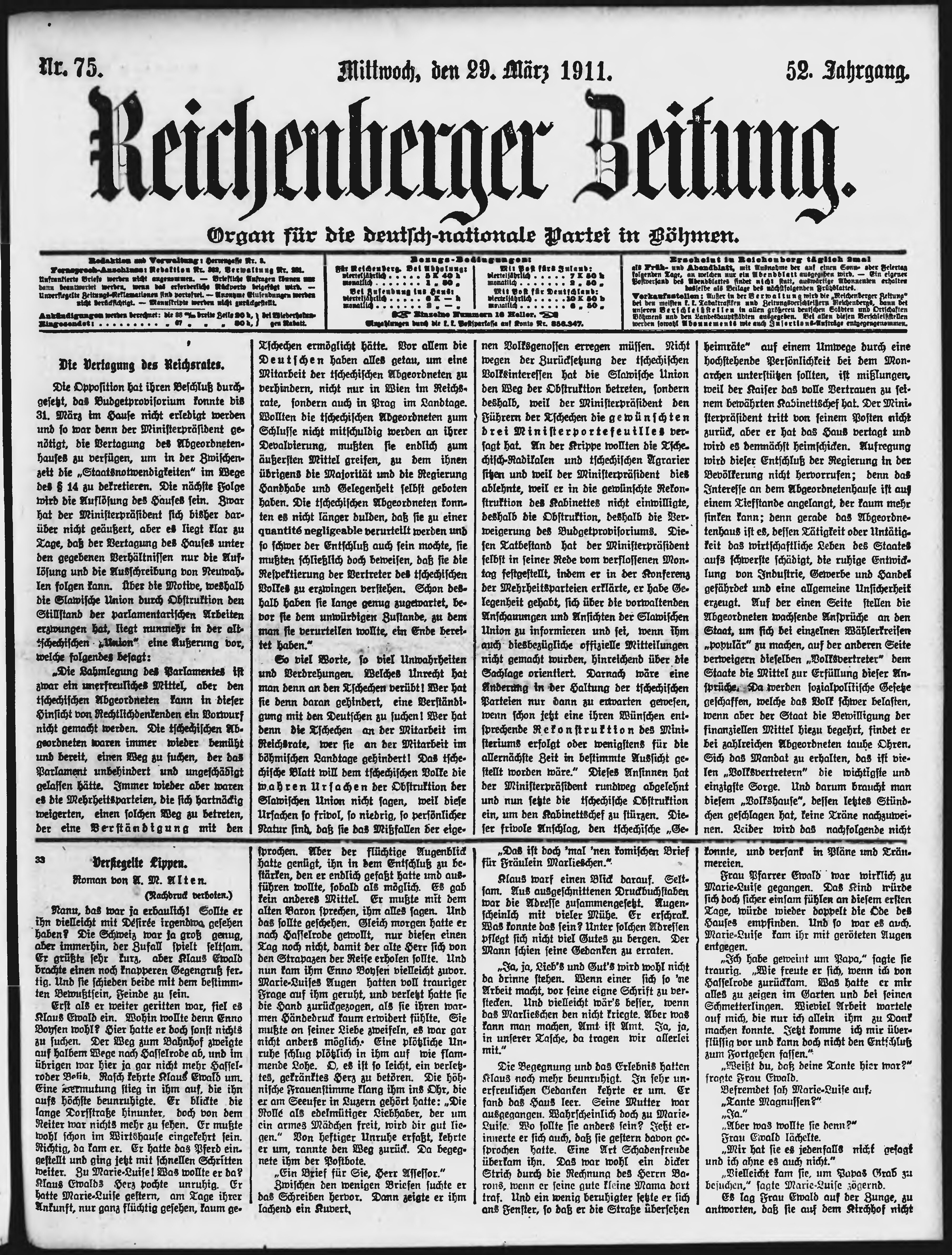 * Datum vydání výtisku: 29.3.1911 Číslo výtisku: 75 Poznámky k výtisku: ranní vydání;