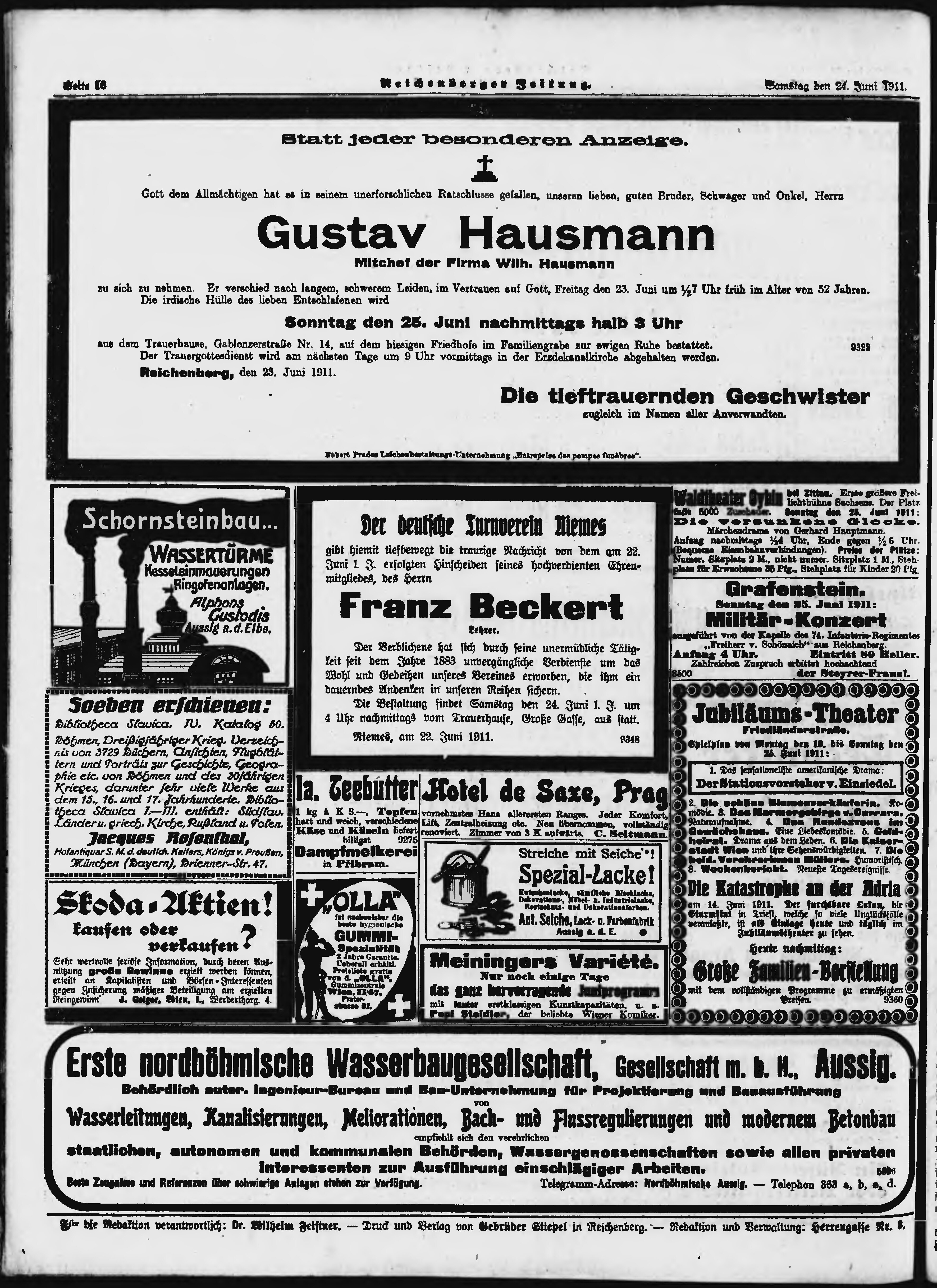 * Datum vydání výtisku: 24.6.1911 Číslo výtisku: 148 Poznámky k výtisku: ranní vydání;