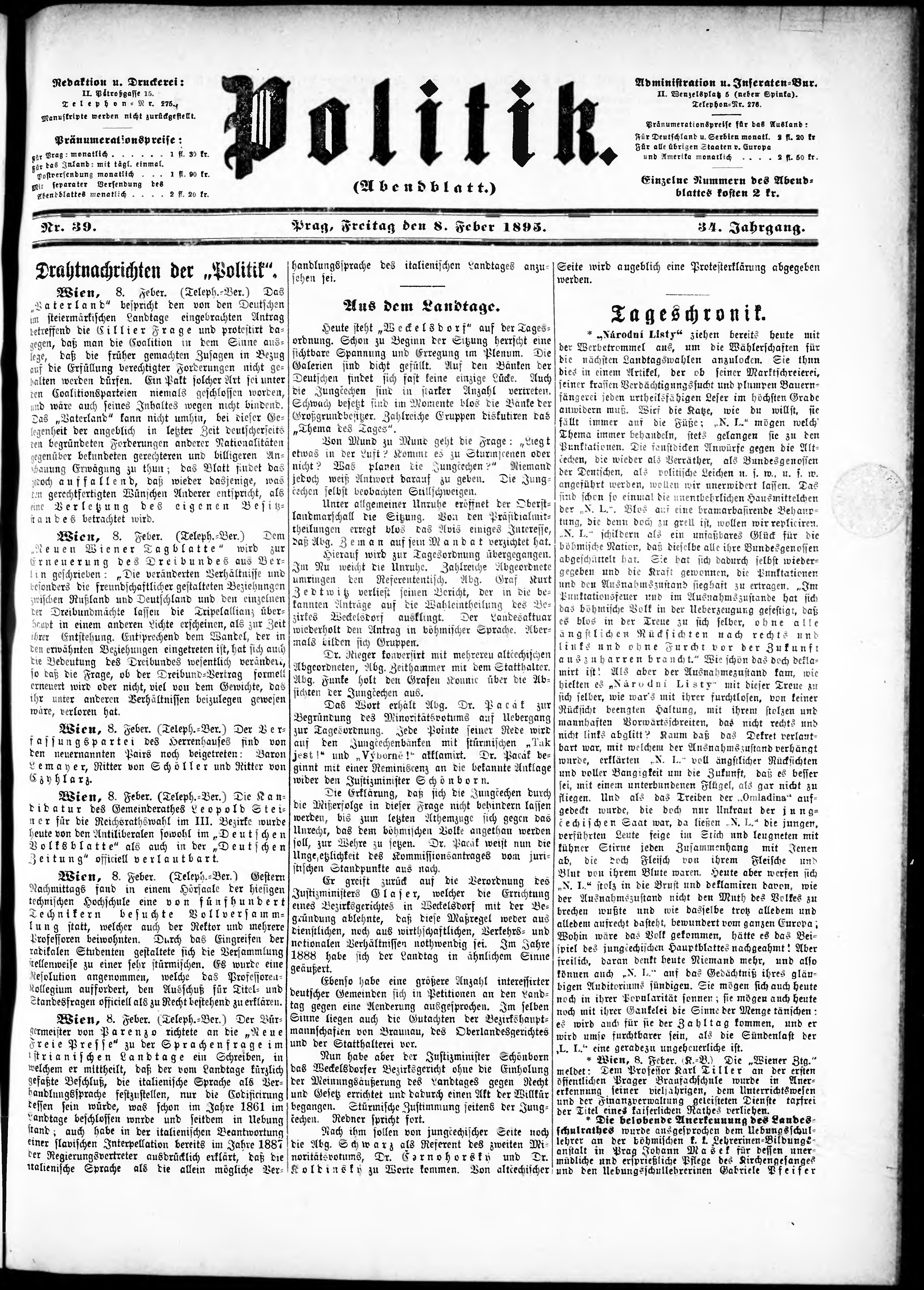 * Datum vydání výtisku: 8.2.1895 Číslo výtisku: 39 Poznámky k výtisku: večerní vydání;