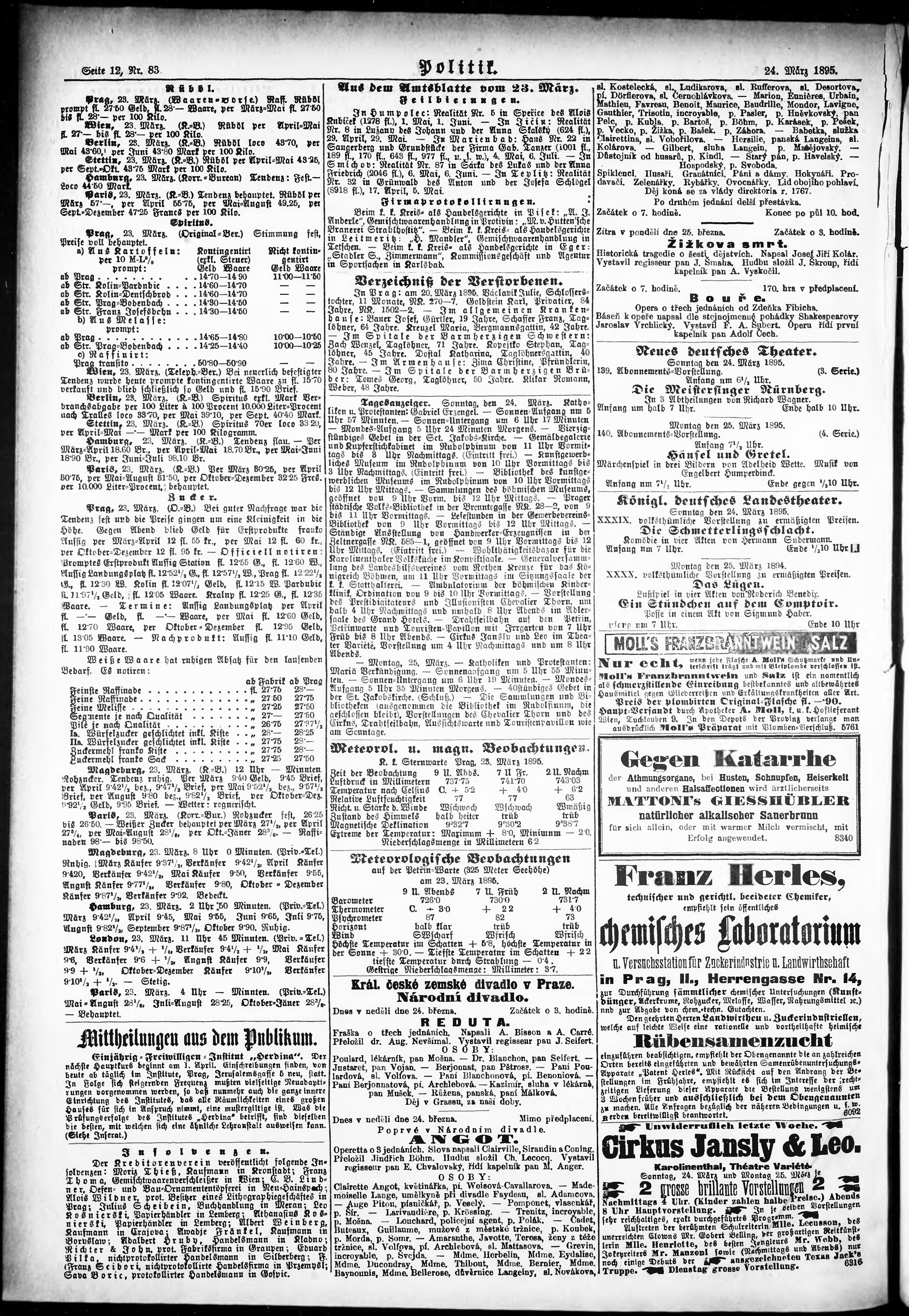 * Datum vydání výtisku: 24.3.1895 Číslo výtisku: 83 Poznámky k výtisku: ranní vydání; nekonzistence číslování stran;