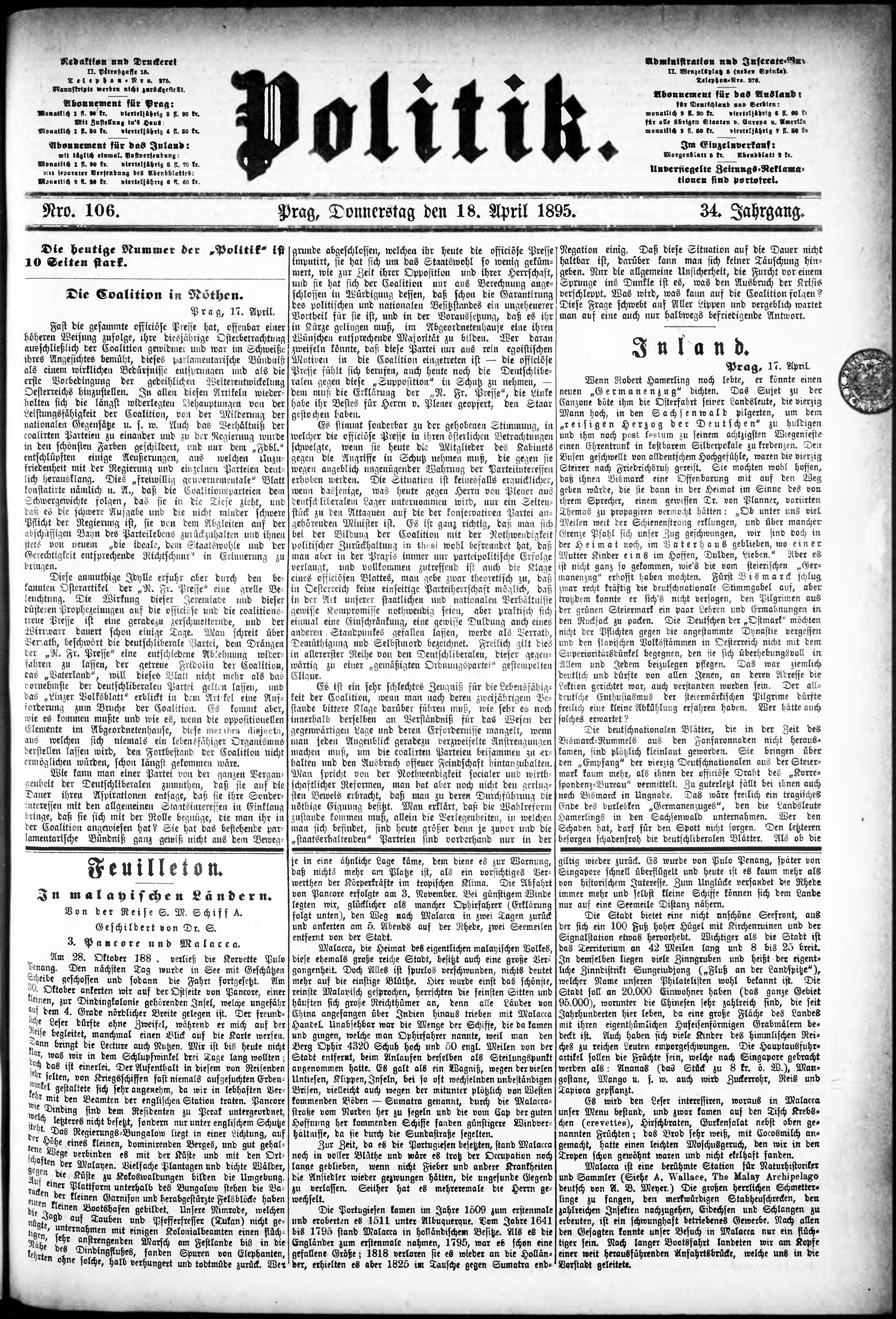 * Datum vydání výtisku: 18.4.1895 Číslo výtisku: 106 Poznámky k výtisku: ranní vydání;