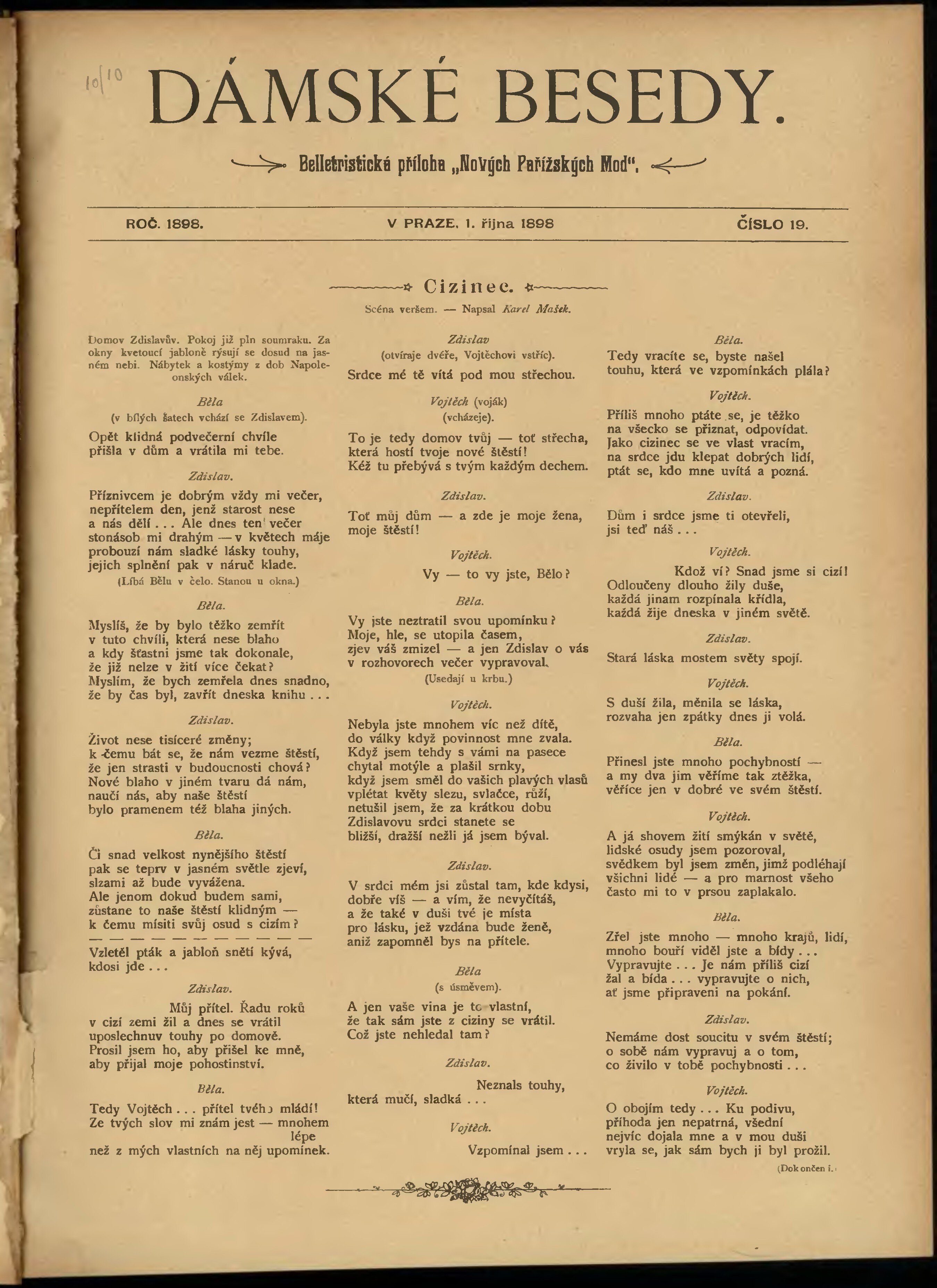 * Datum vydání výtisku: 1.10.1898 Číslo výtisku: 19 Typ výtisku: příloha Poznámky k výtisku: belletristická příloha;