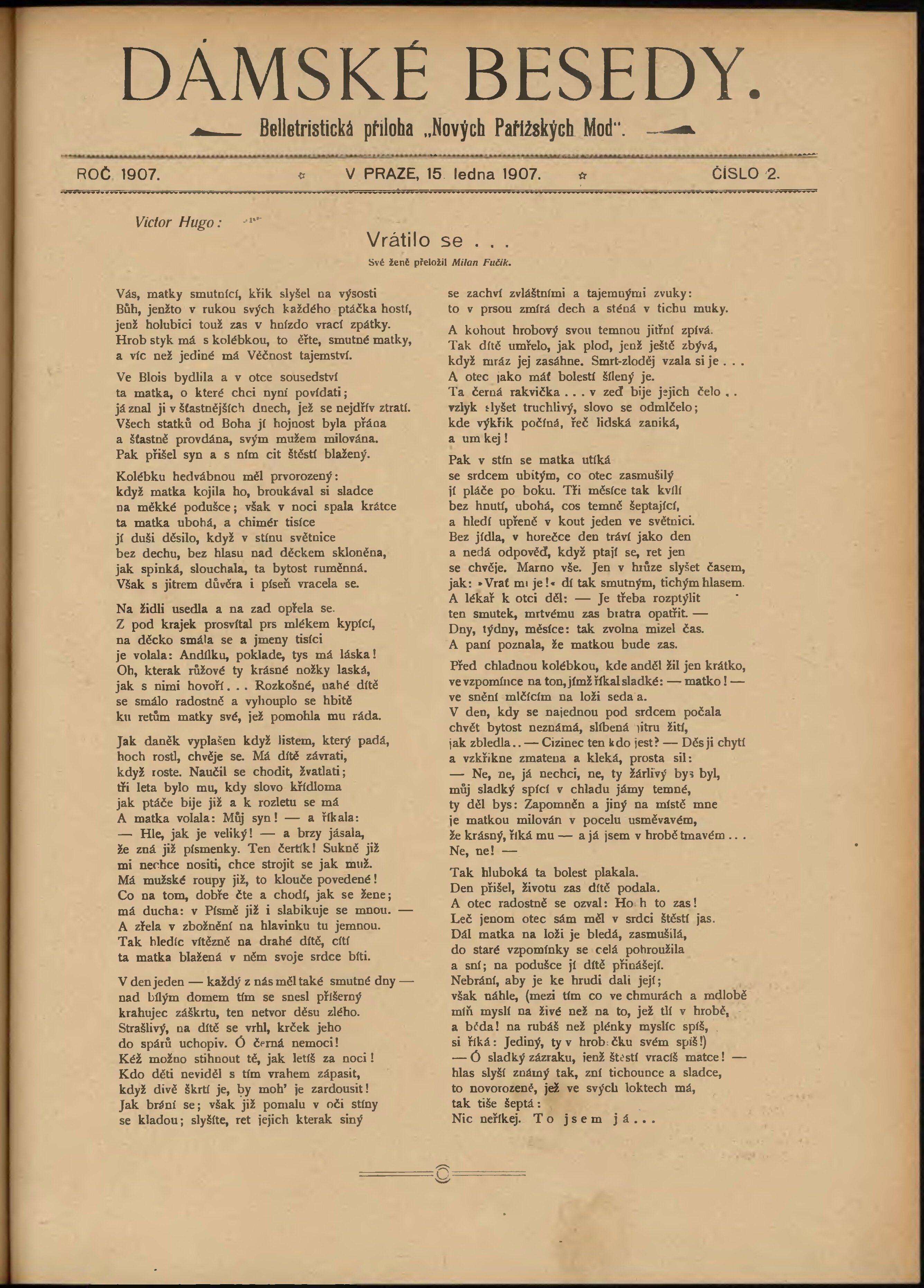 * Datum vydání výtisku: 15.1.1907 Číslo výtisku: 2 Typ výtisku: příloha Poznámky k výtisku: belletristická příloha;