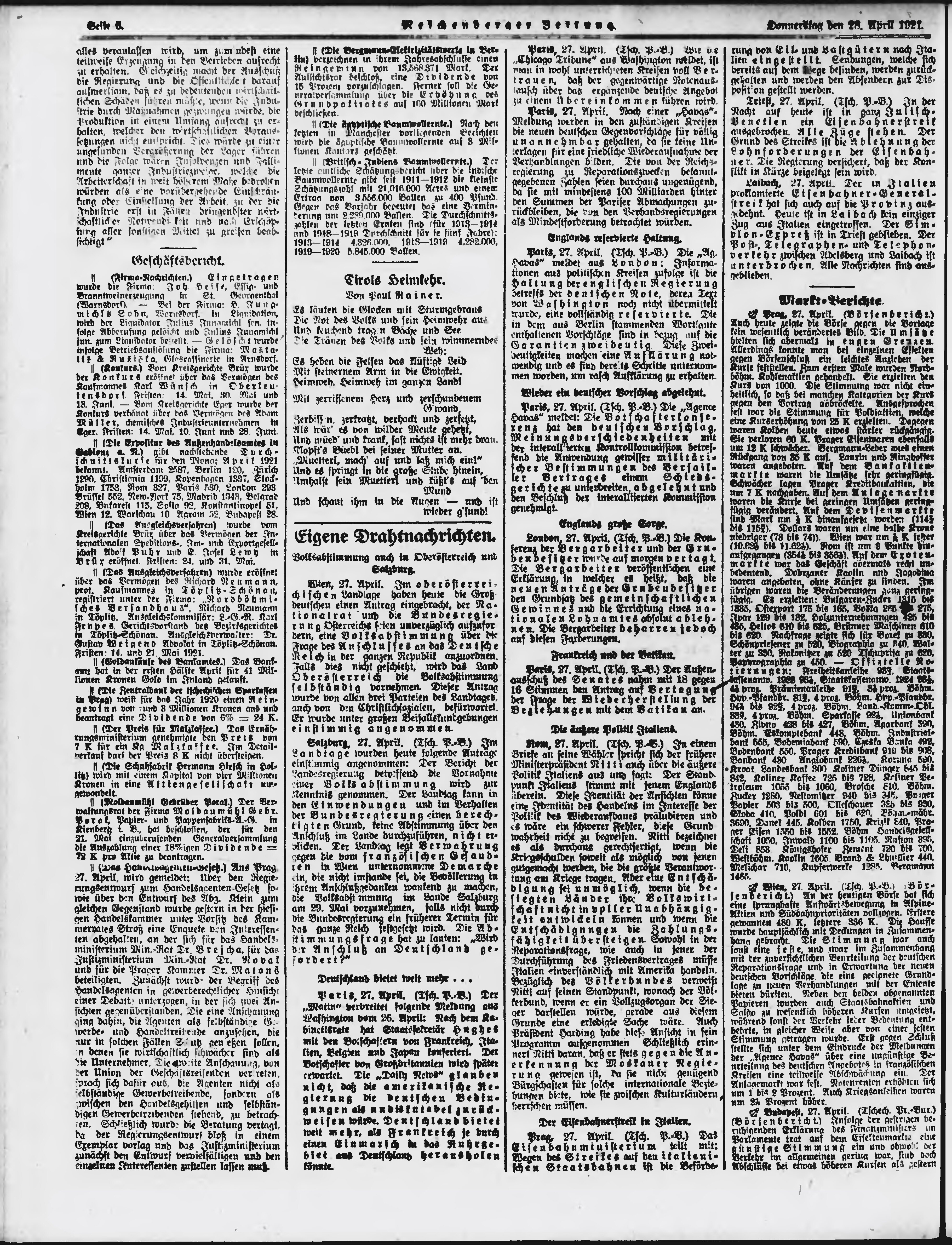 * Datum vydání výtisku: 28.4.1921 Číslo výtisku: 98 Poznámky k výtisku: ranní vydání;