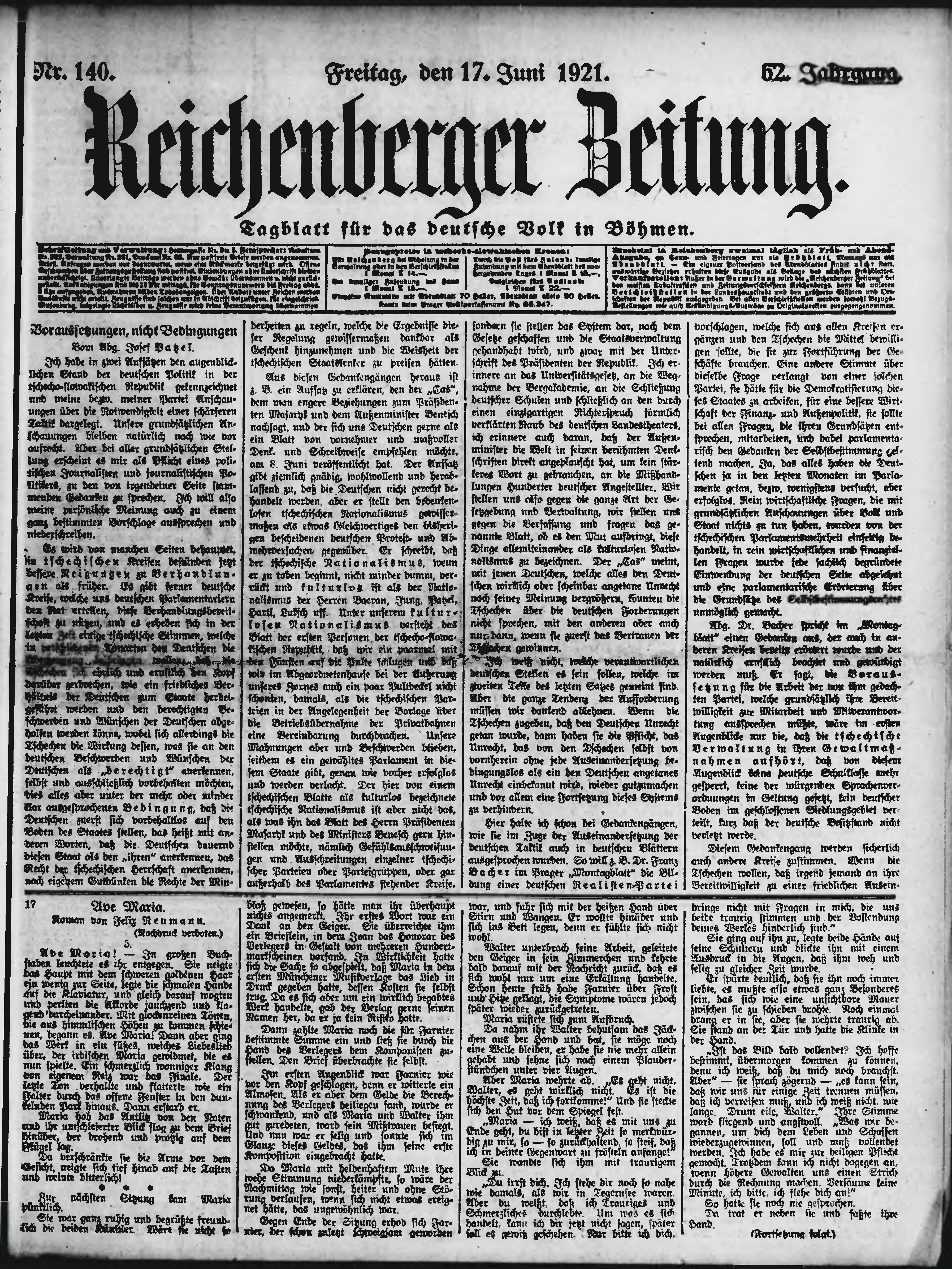 * Datum vydání výtisku: 17.6.1921 Číslo výtisku: 140 Poznámky k výtisku: ranní vydání;