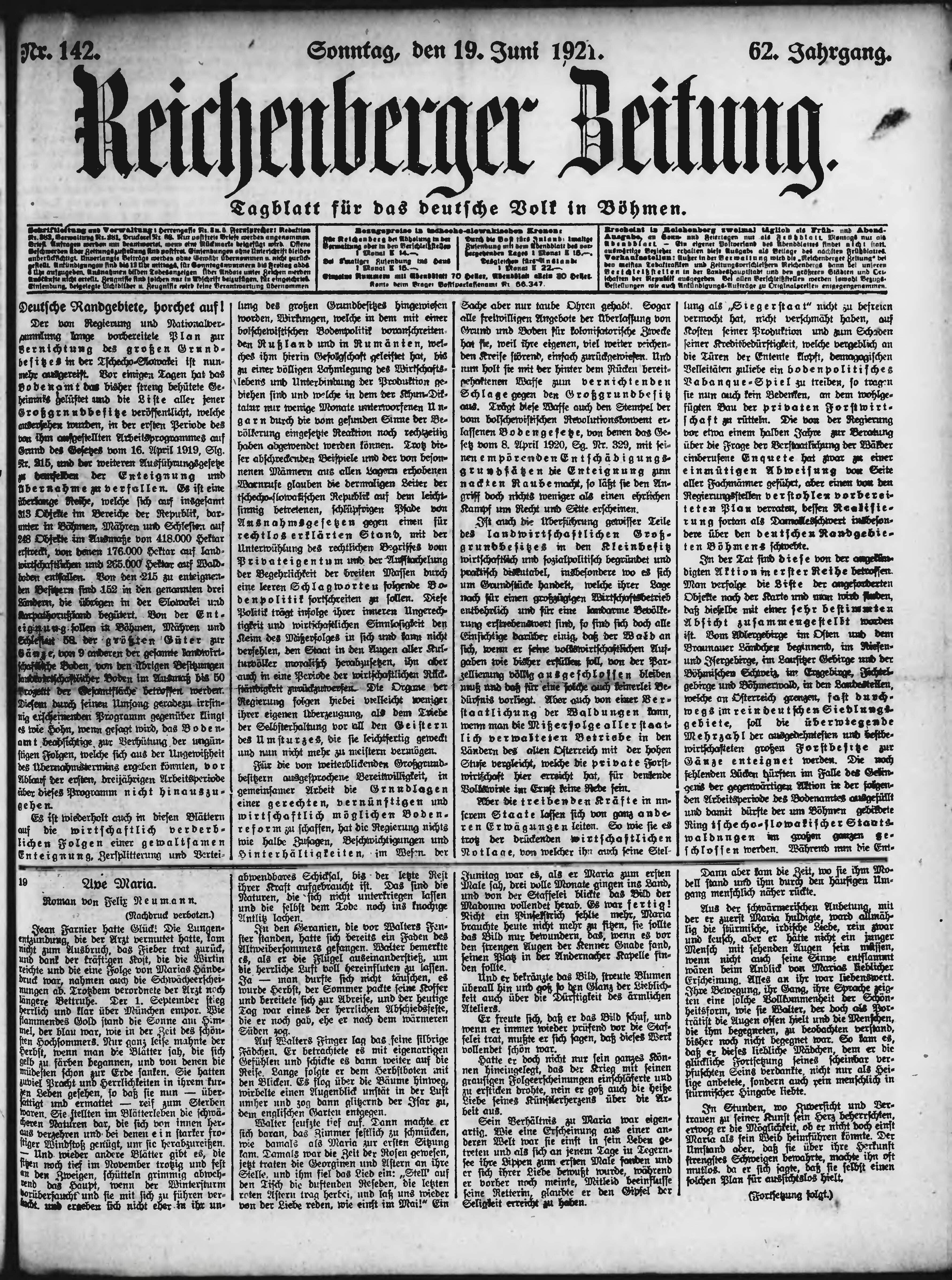 * Datum vydání výtisku: 19.6.1921 Číslo výtisku: 142 Poznámky k výtisku: ranní vydání;