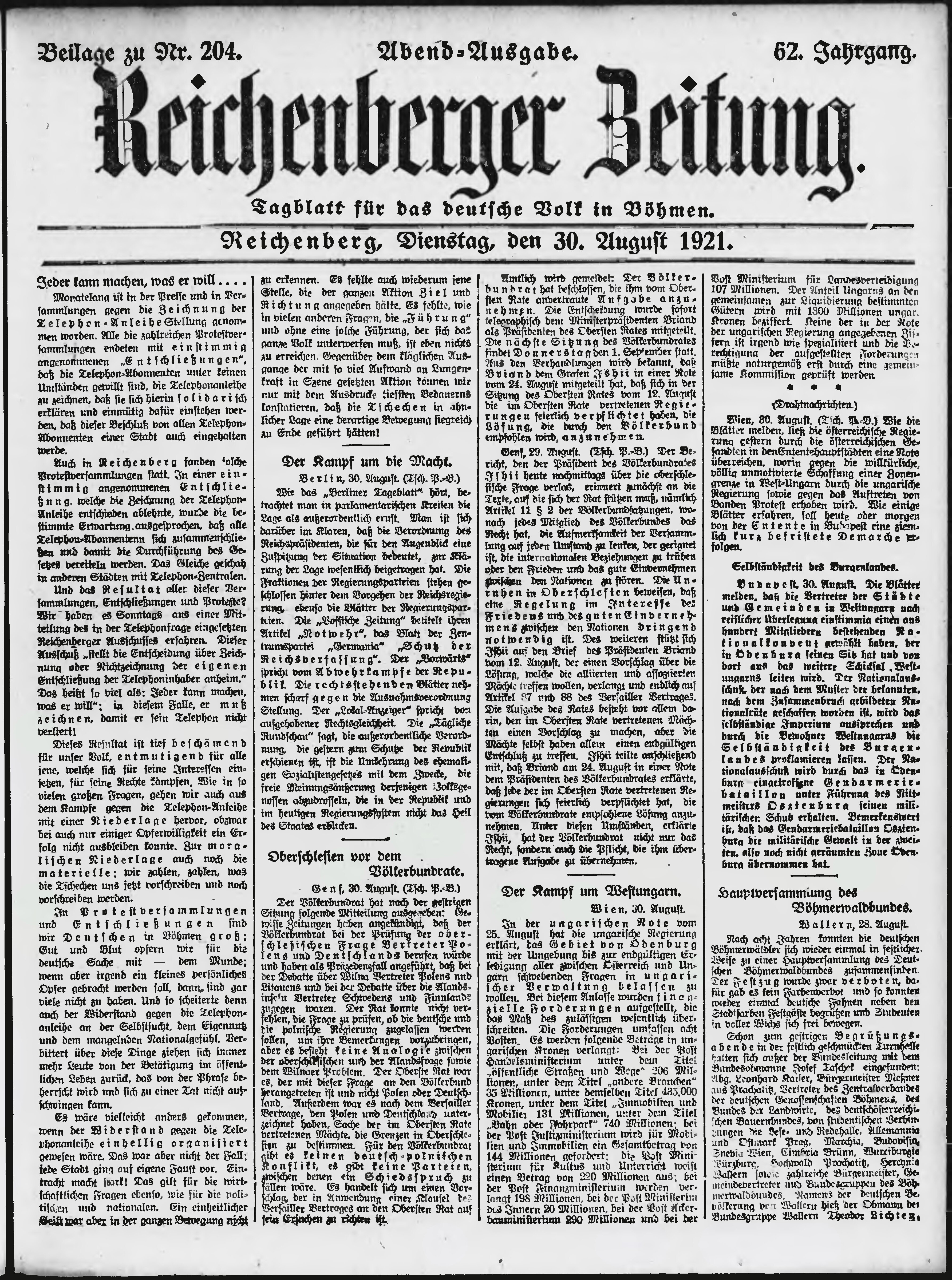 * Datum vydání výtisku: 30.8.1921 Číslo výtisku: 204 Typ výtisku: příloha Poznámky k výtisku: večerní vydání;