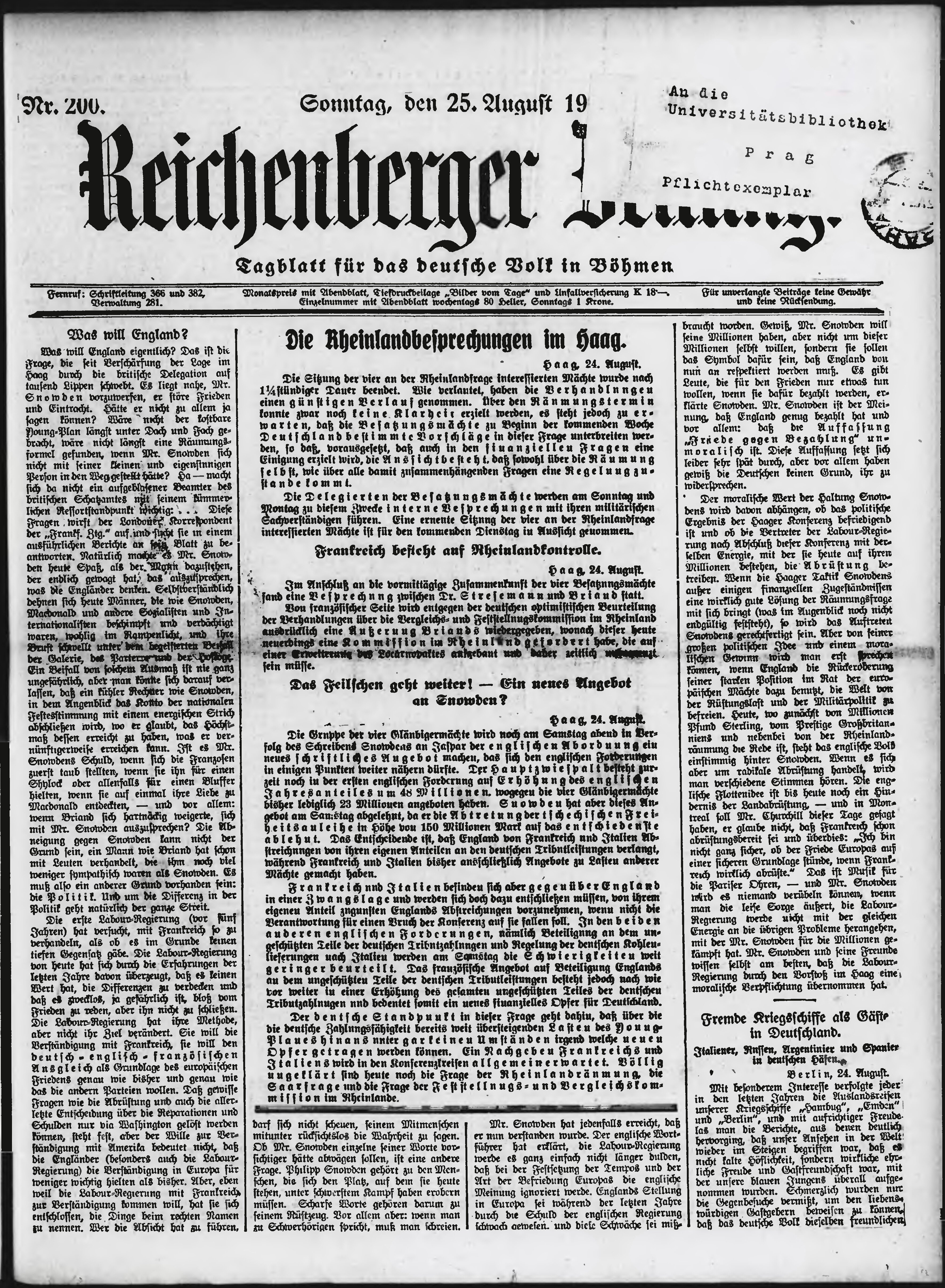 * Datum vydání výtisku: 25.8.1929 Číslo výtisku: 200 Poznámky k výtisku: ranní vydání;
