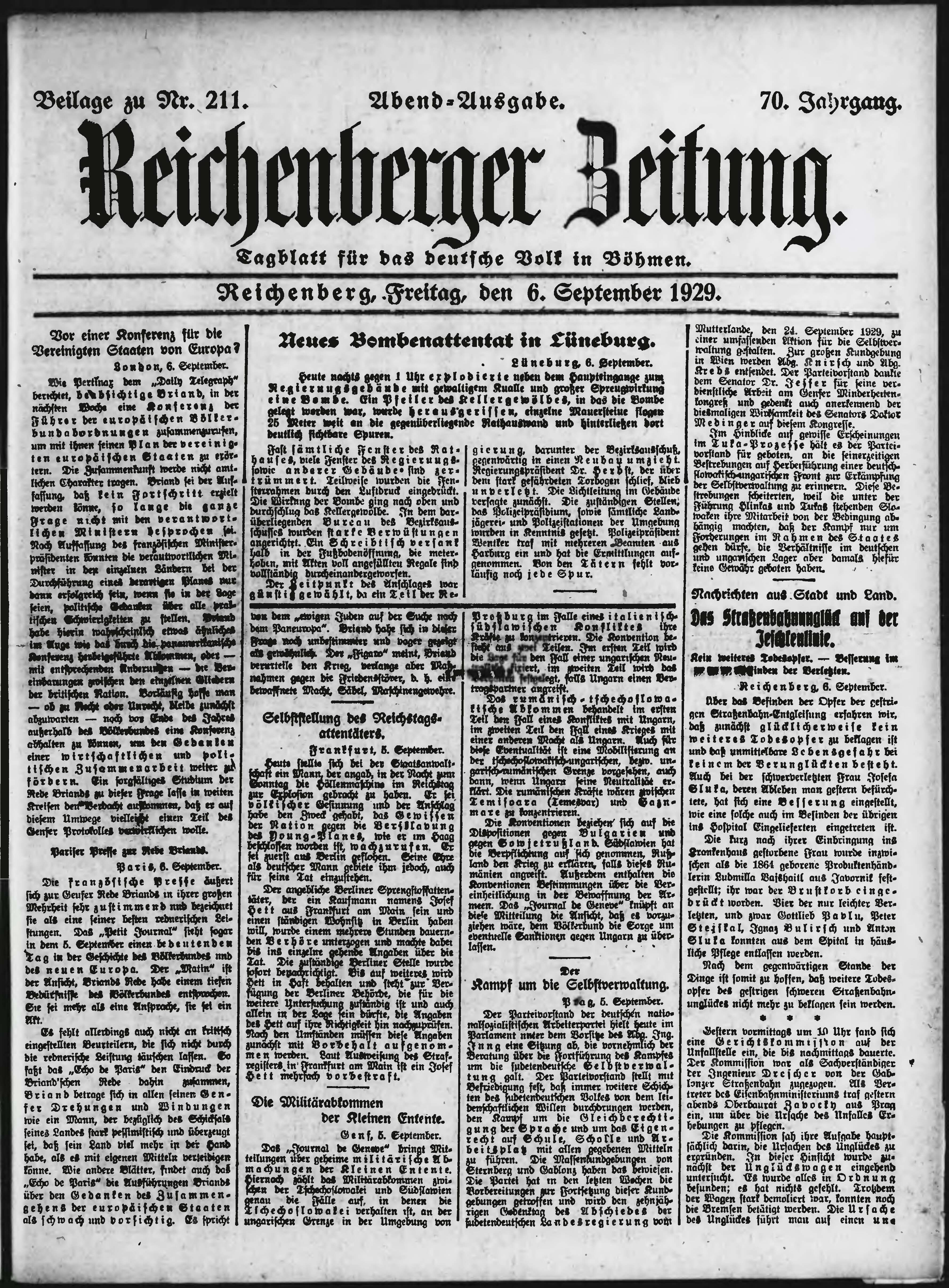* Datum vydání výtisku: 6.9.1929 Číslo výtisku: 211 Typ výtisku: příloha Poznámky k výtisku: večerní vydání;