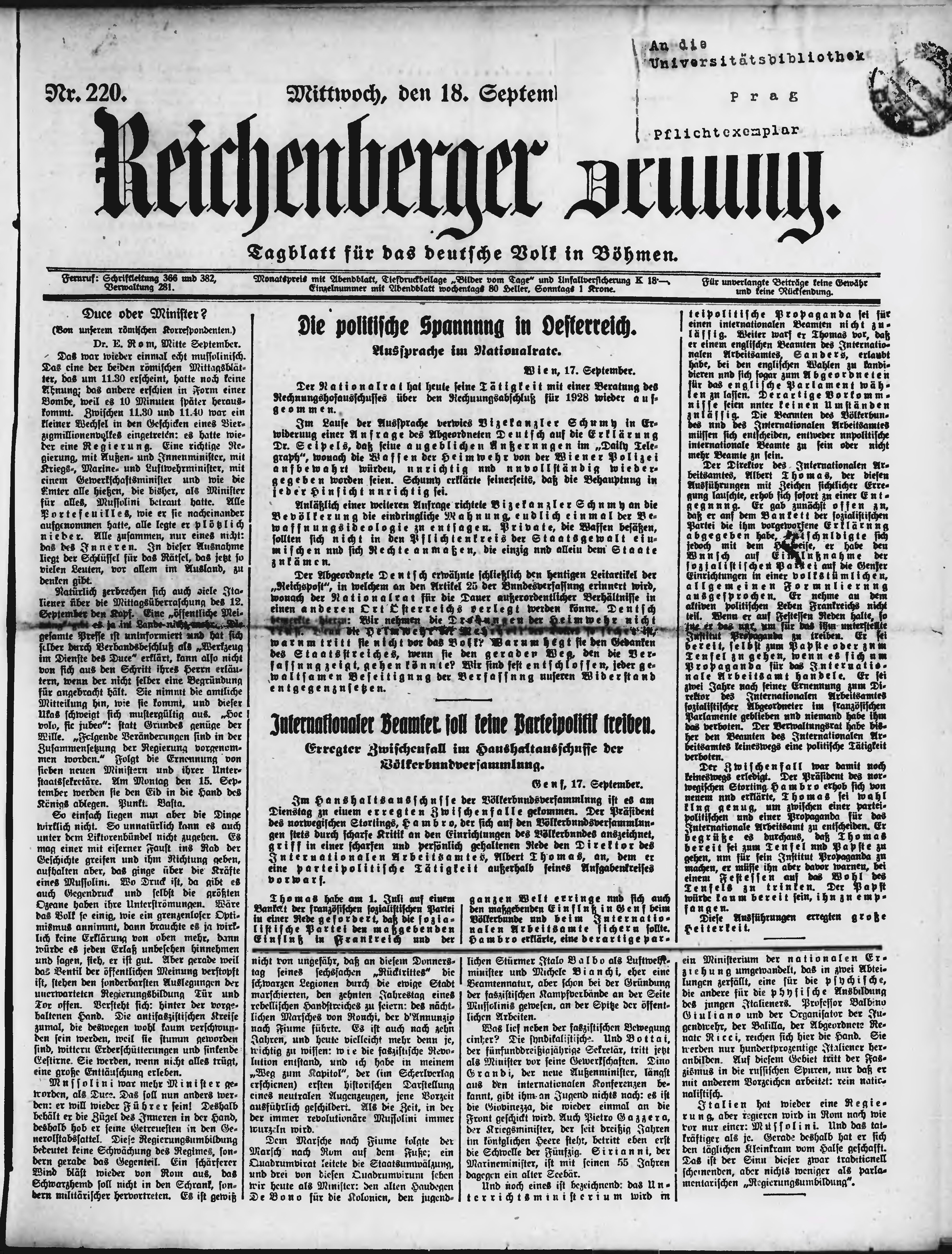 * Datum vydání výtisku: 18.9.1929 Číslo výtisku: 220 Poznámky k výtisku: ranní vydání;
