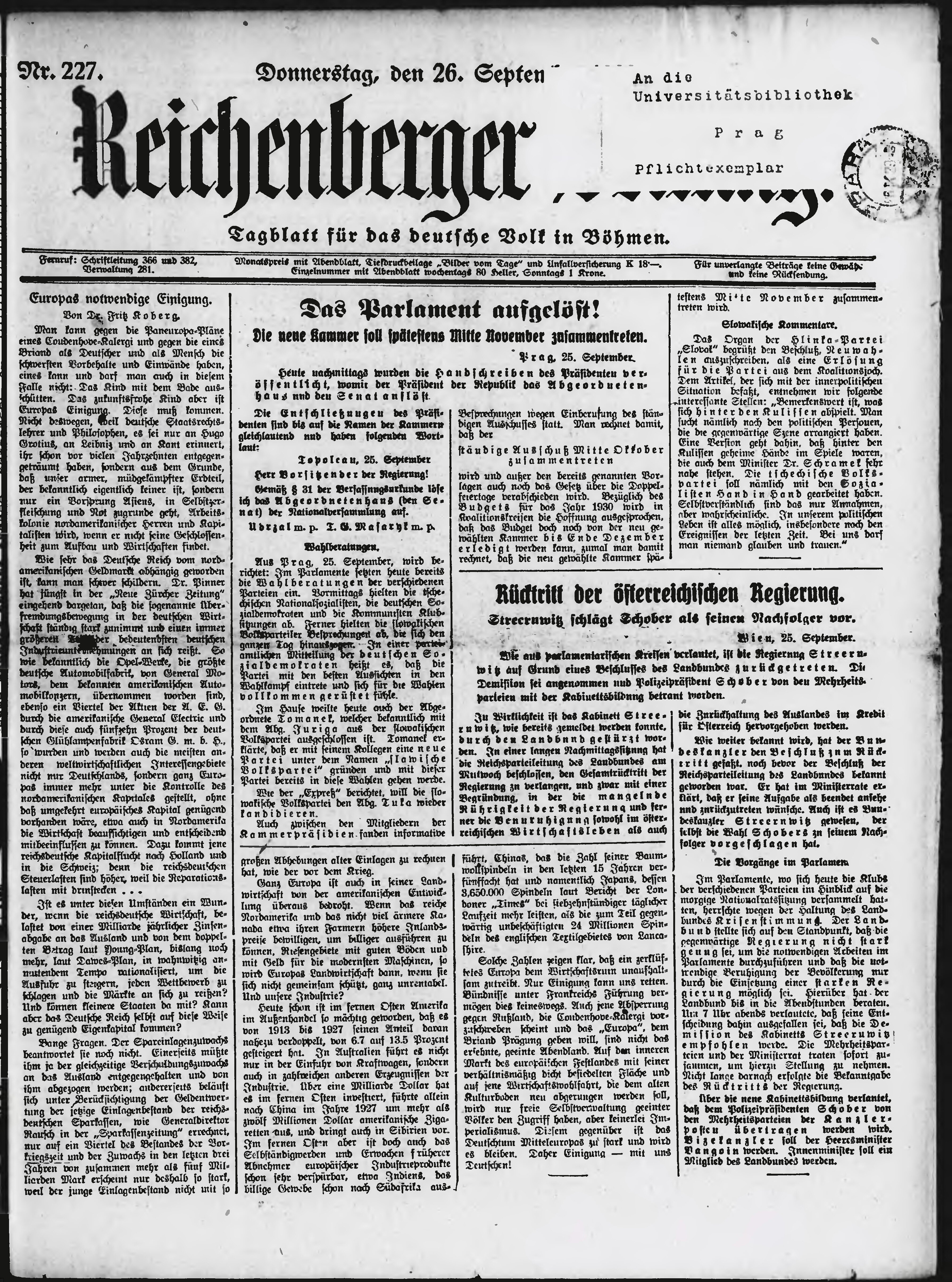 * Datum vydání výtisku: 26.9.1929 Číslo výtisku: 227 Poznámky k výtisku: ranní vydání;