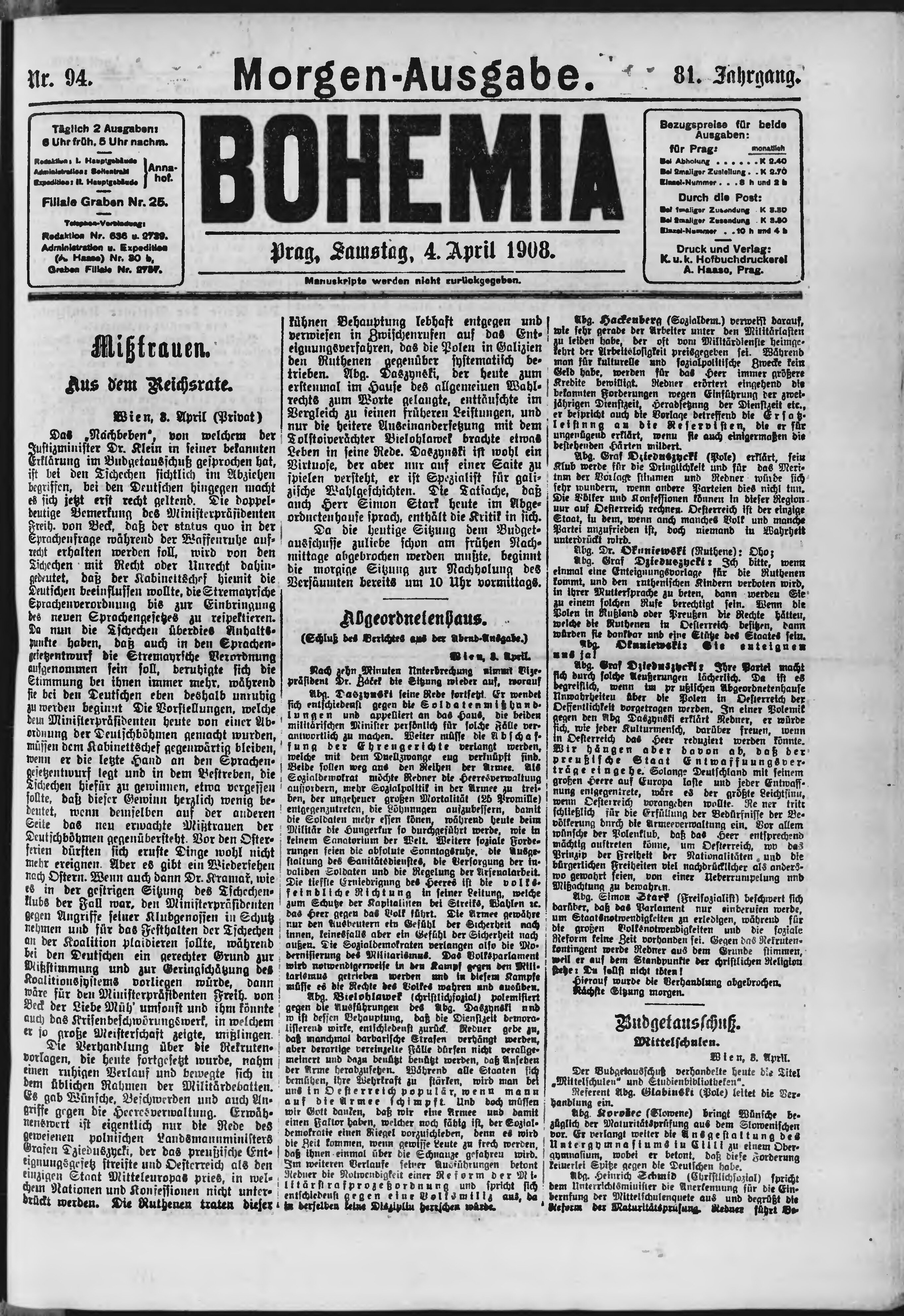 * Datum vydání výtisku: 4.4.1908 Číslo výtisku: 94 Poznámky k výtisku: ranní vydání;