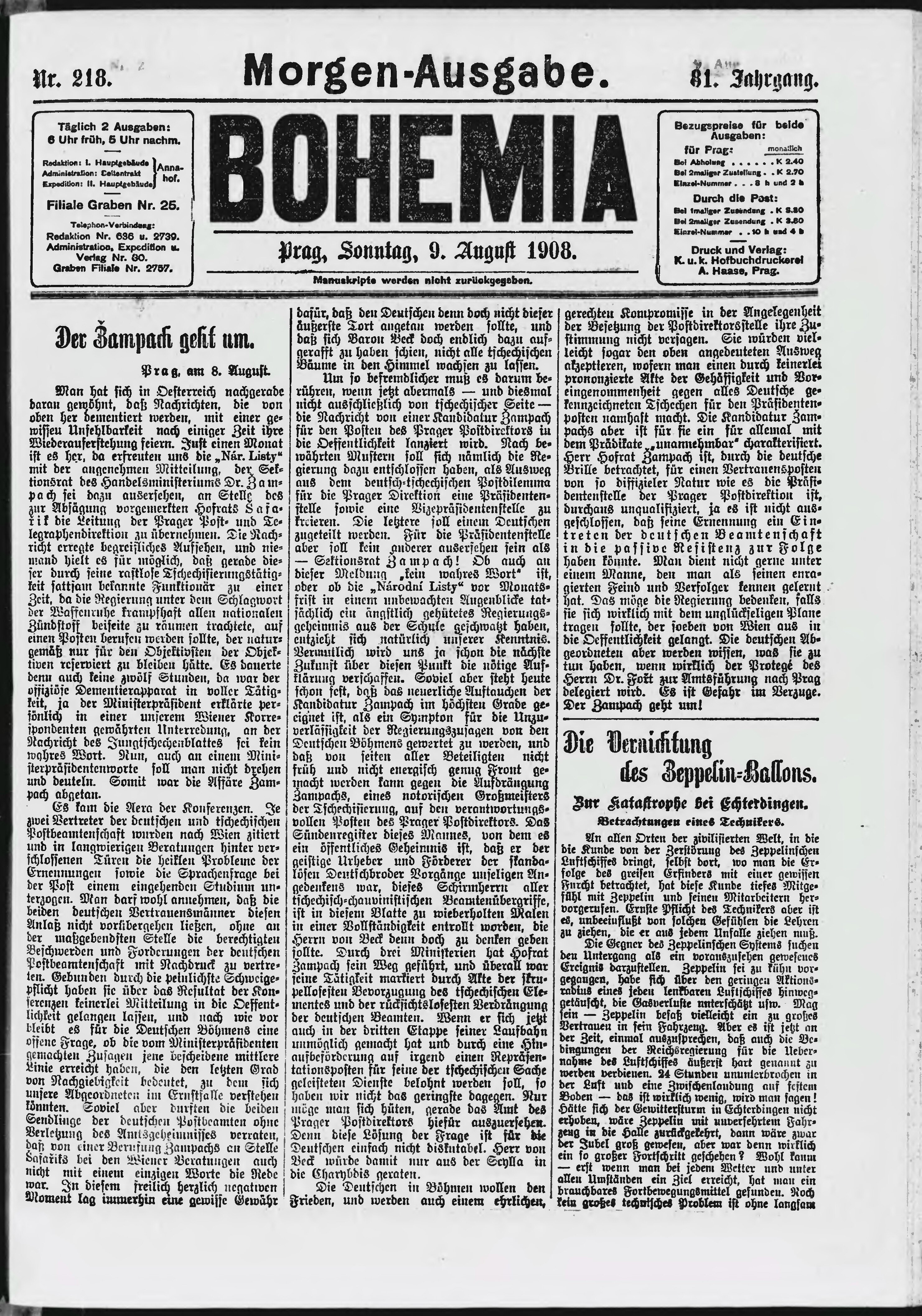 * Datum vydání výtisku: 9.8.1908 Číslo výtisku: 218 Poznámky k výtisku: ranní vydání;
