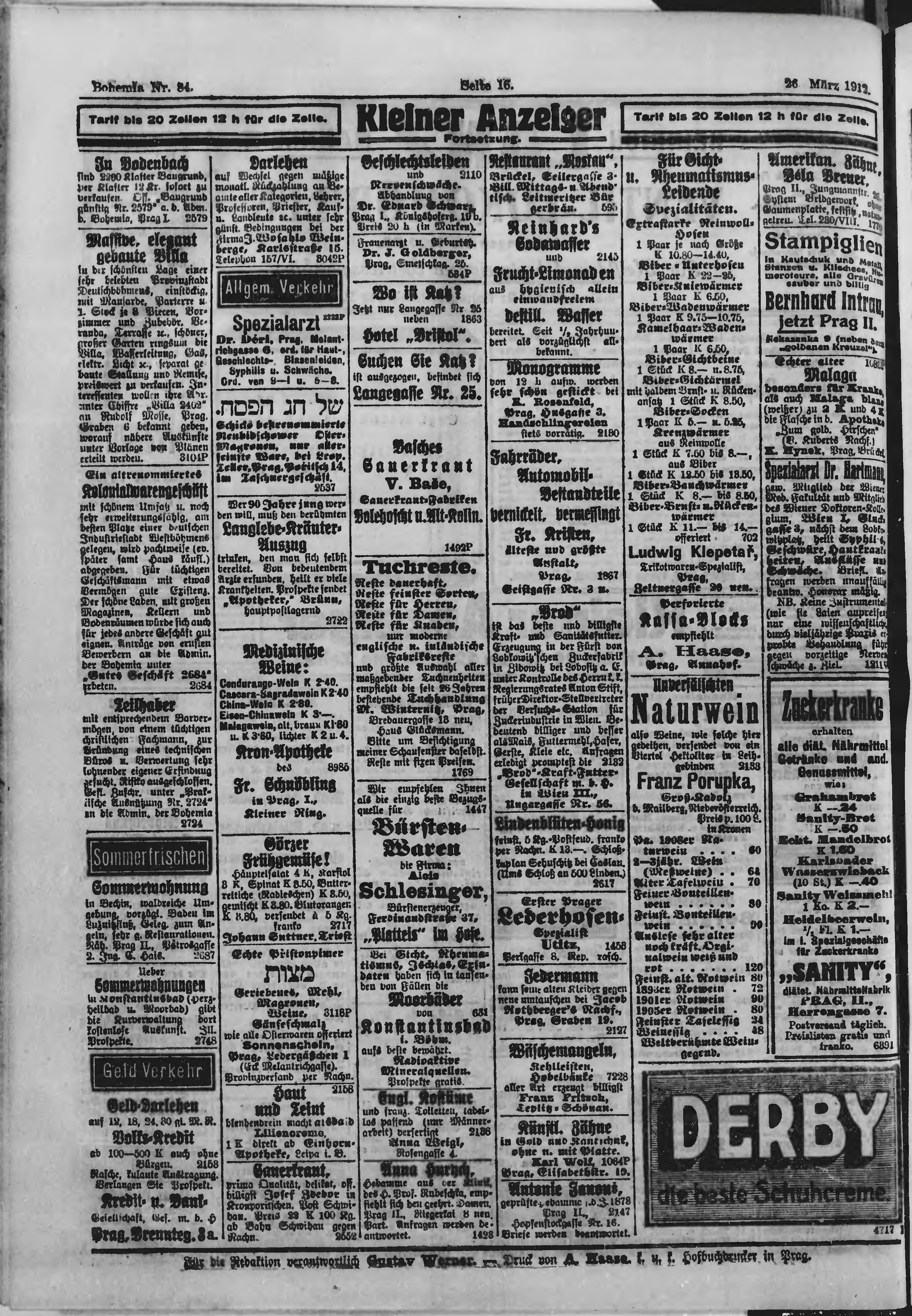 * Datum vydání výtisku: 26.3.1912 Číslo výtisku: 84 Poznámky k výtisku: polední vydání;