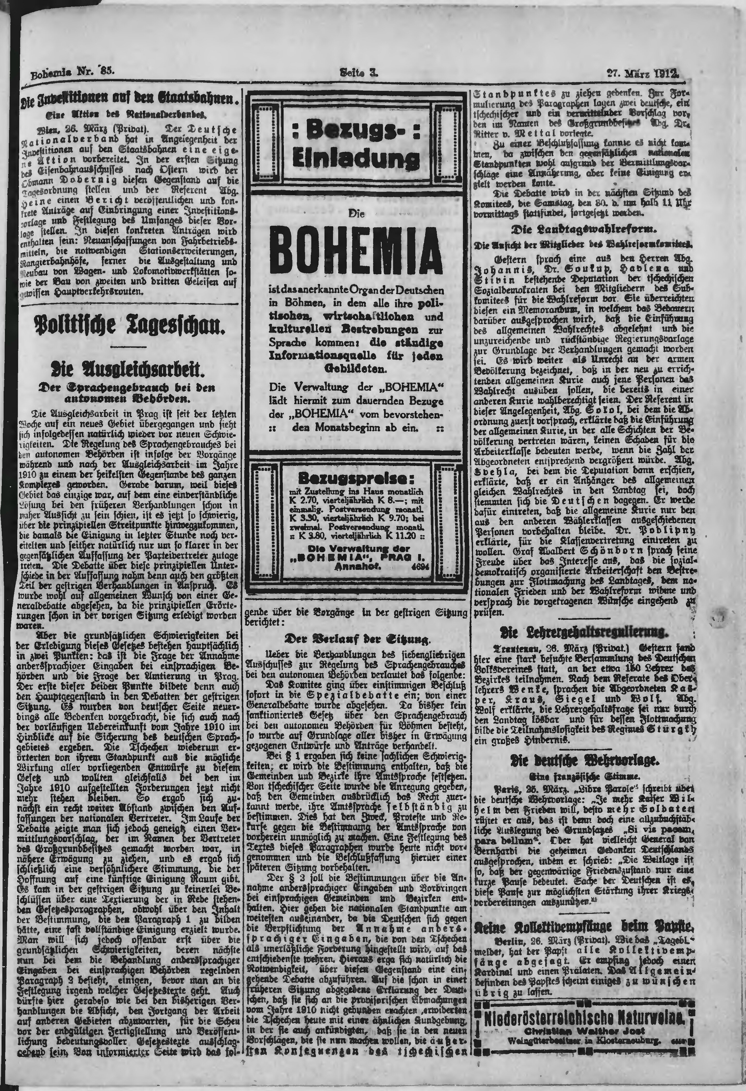 * Datum vydání výtisku: 27.3.1912 Číslo výtisku: 85 Poznámky k výtisku: ranní vydání;