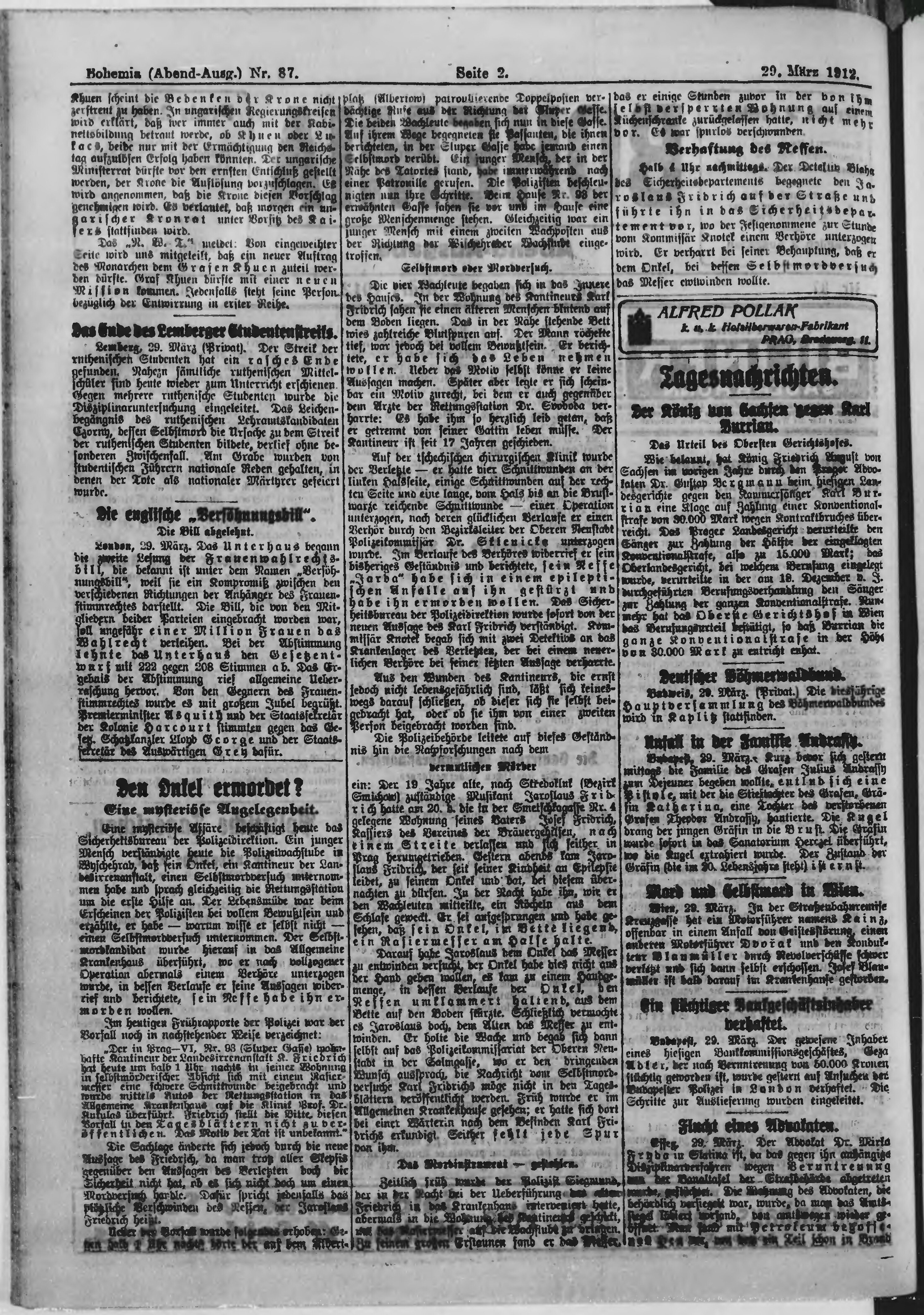 * Datum vydání výtisku: 29.3.1912 Číslo výtisku: 87 Poznámky k výtisku: večerní vydání