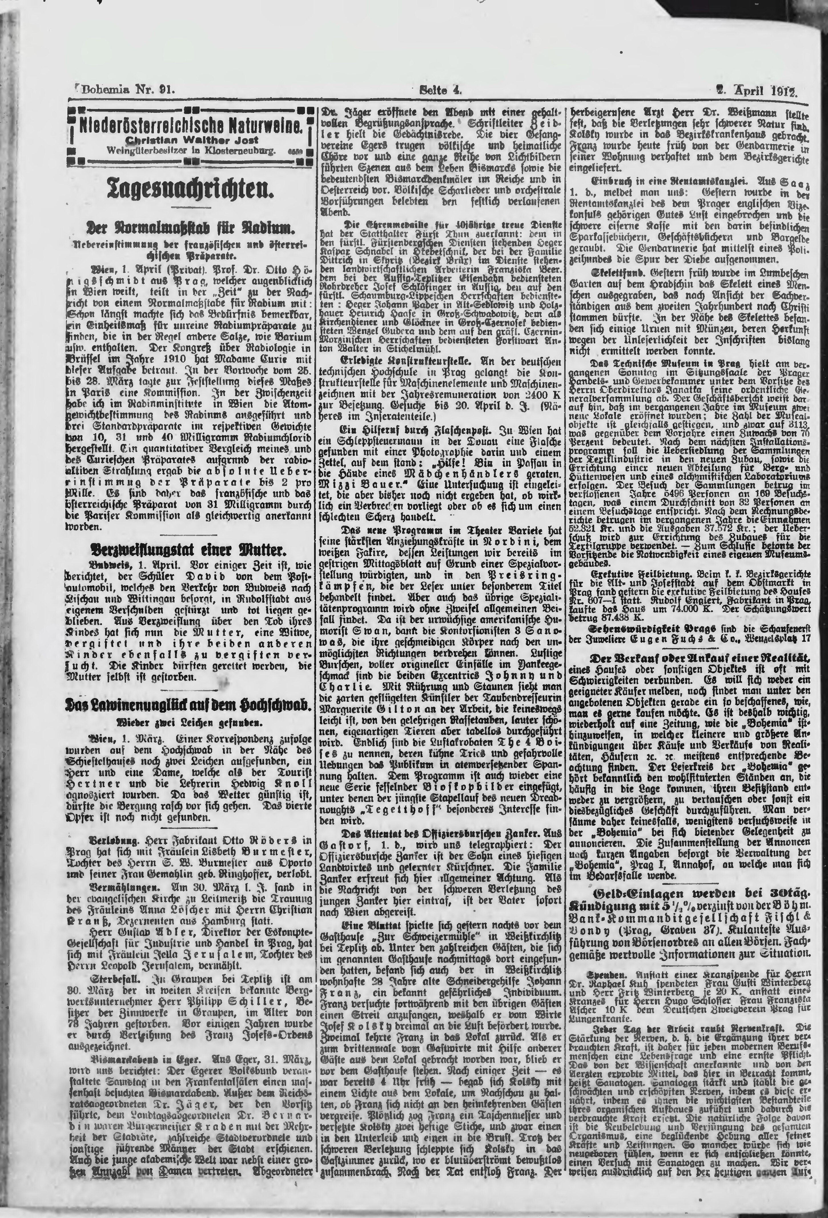 * Datum vydání výtisku: 2.4.1912 Číslo výtisku: 91 Poznámky k výtisku: ranní vydání;