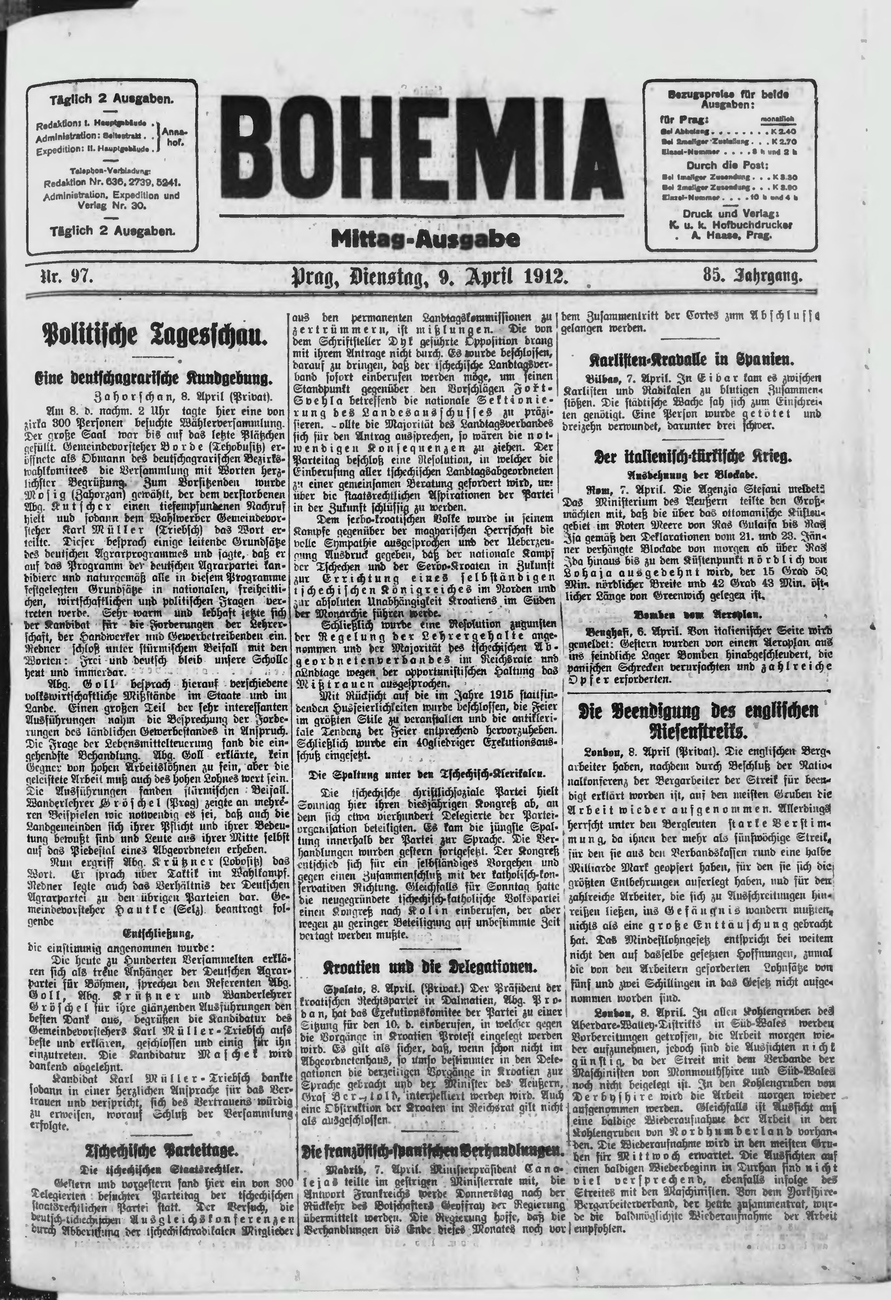 * Datum vydání výtisku: 9.4.1912 Číslo výtisku: 97 Poznámky k výtisku: polední vydání;
