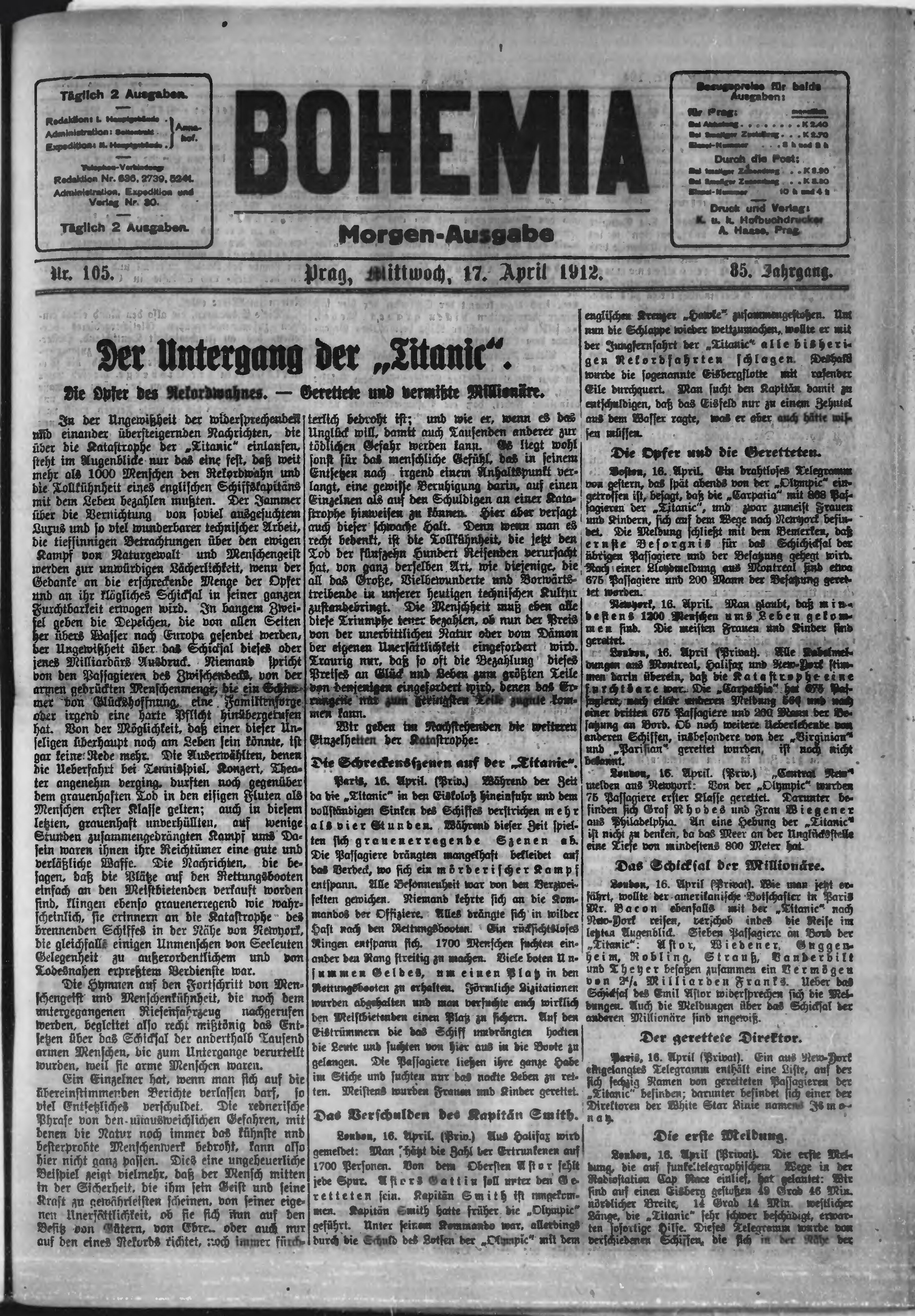 * Datum vydání výtisku: 17.4.1912 Číslo výtisku: 105 Poznámky k výtisku: ranní vydání;