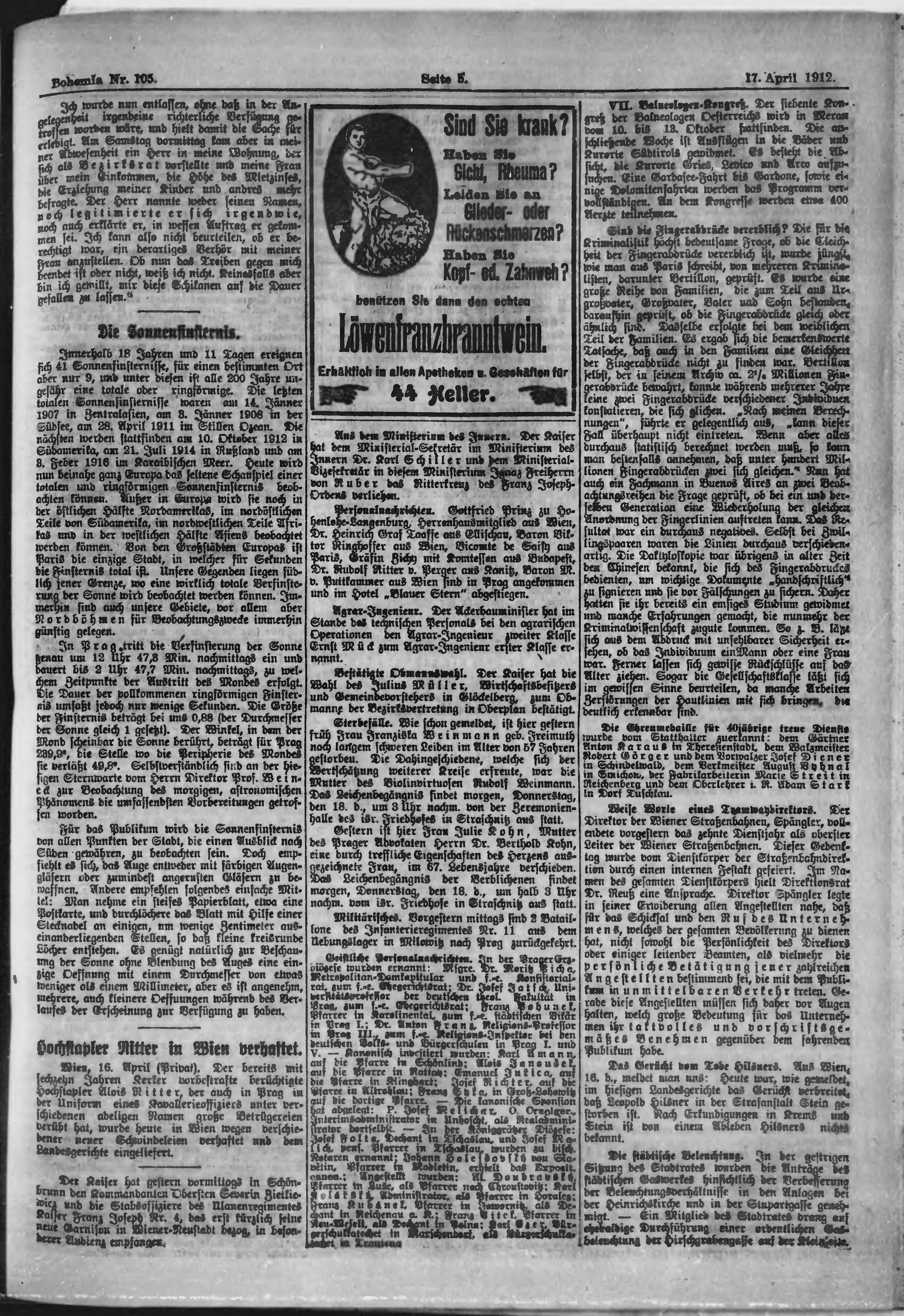 * Datum vydání výtisku: 17.4.1912 Číslo výtisku: 105 Poznámky k výtisku: ranní vydání;