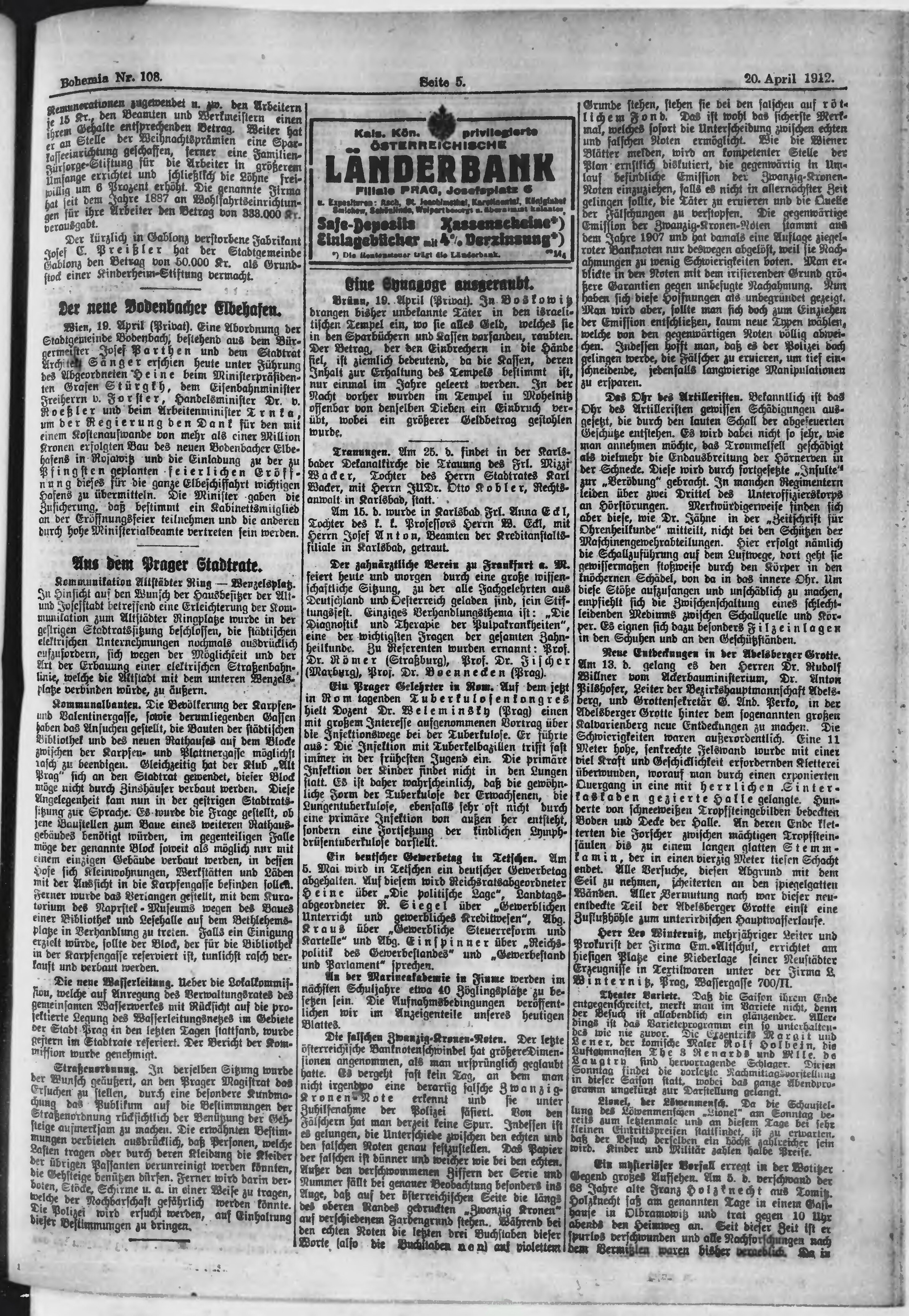 * Datum vydání výtisku: 20.4.1912 Číslo výtisku: 108 Poznámky k výtisku: ranní vydání;