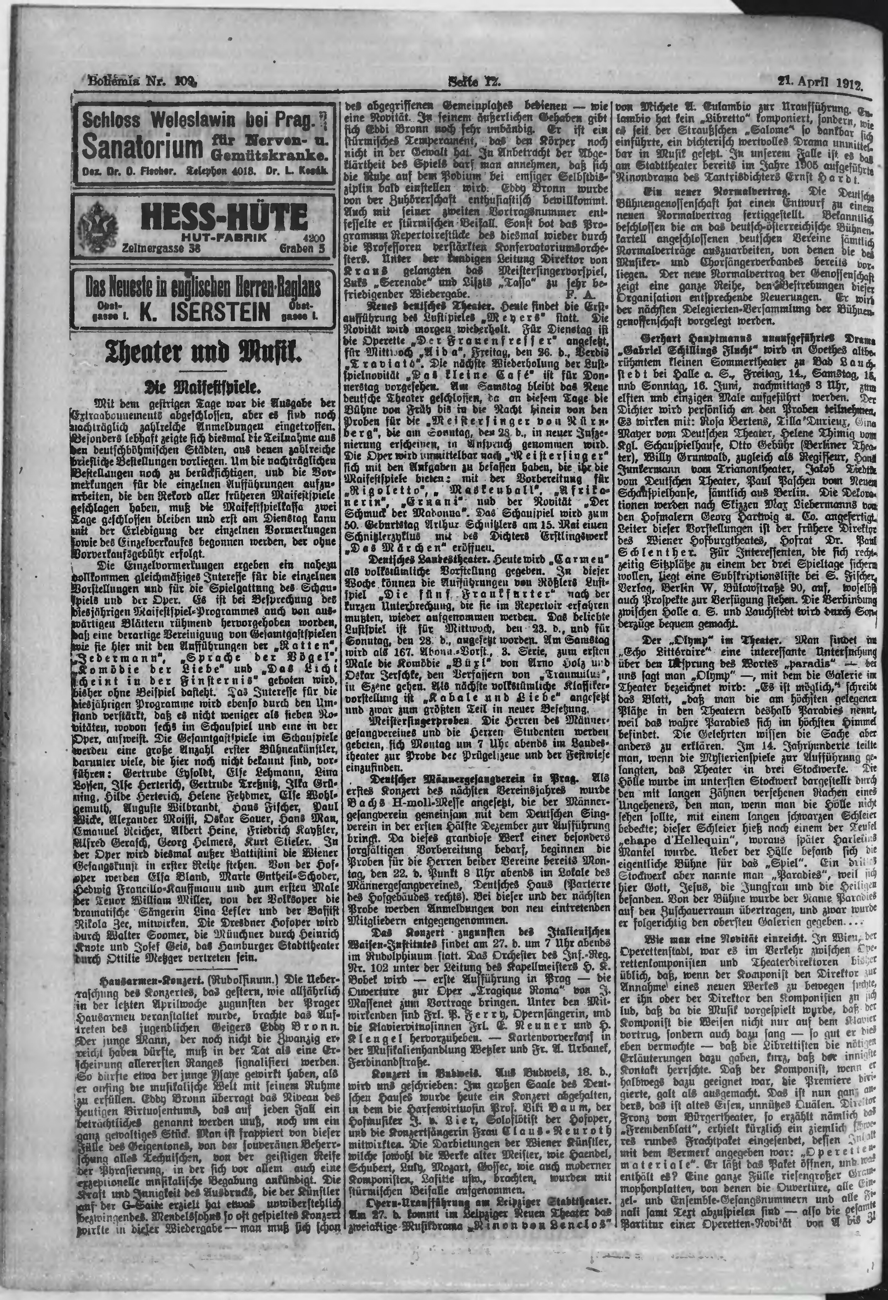 * Datum vydání výtisku: 21.4.1912 Číslo výtisku: 109 Poznámky k výtisku: ranní vydání;