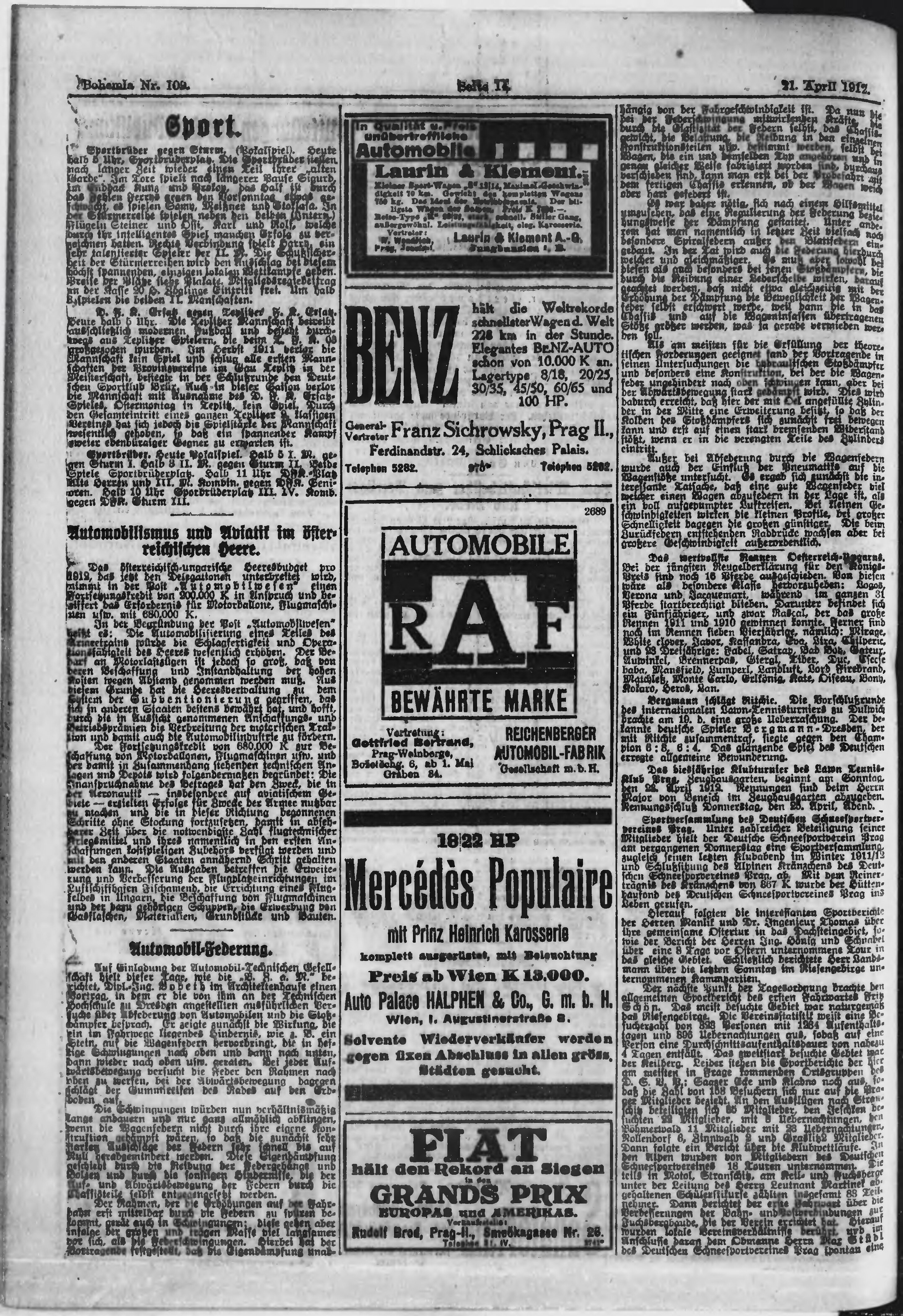 * Datum vydání výtisku: 21.4.1912 Číslo výtisku: 109 Poznámky k výtisku: ranní vydání;