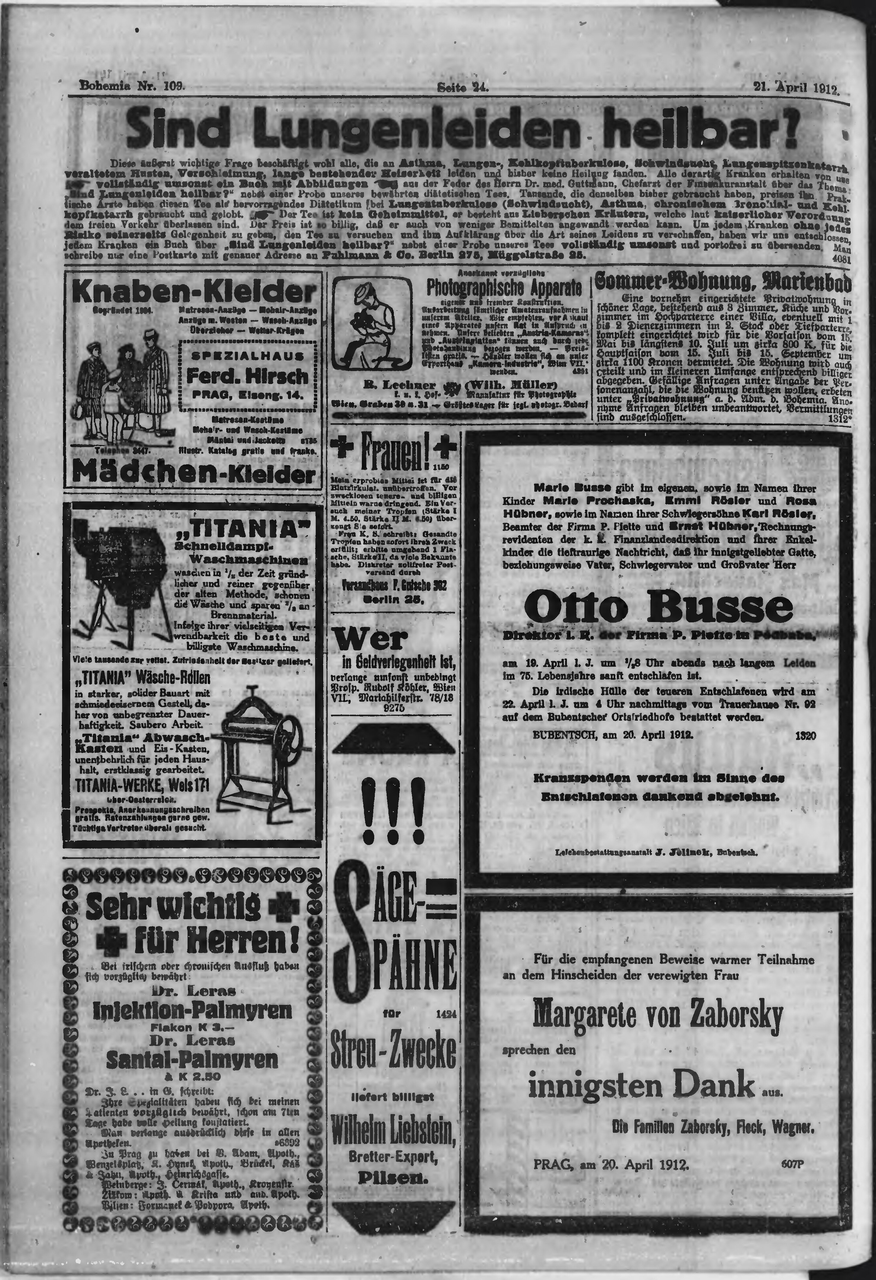 * Datum vydání výtisku: 21.4.1912 Číslo výtisku: 109 Poznámky k výtisku: ranní vydání;