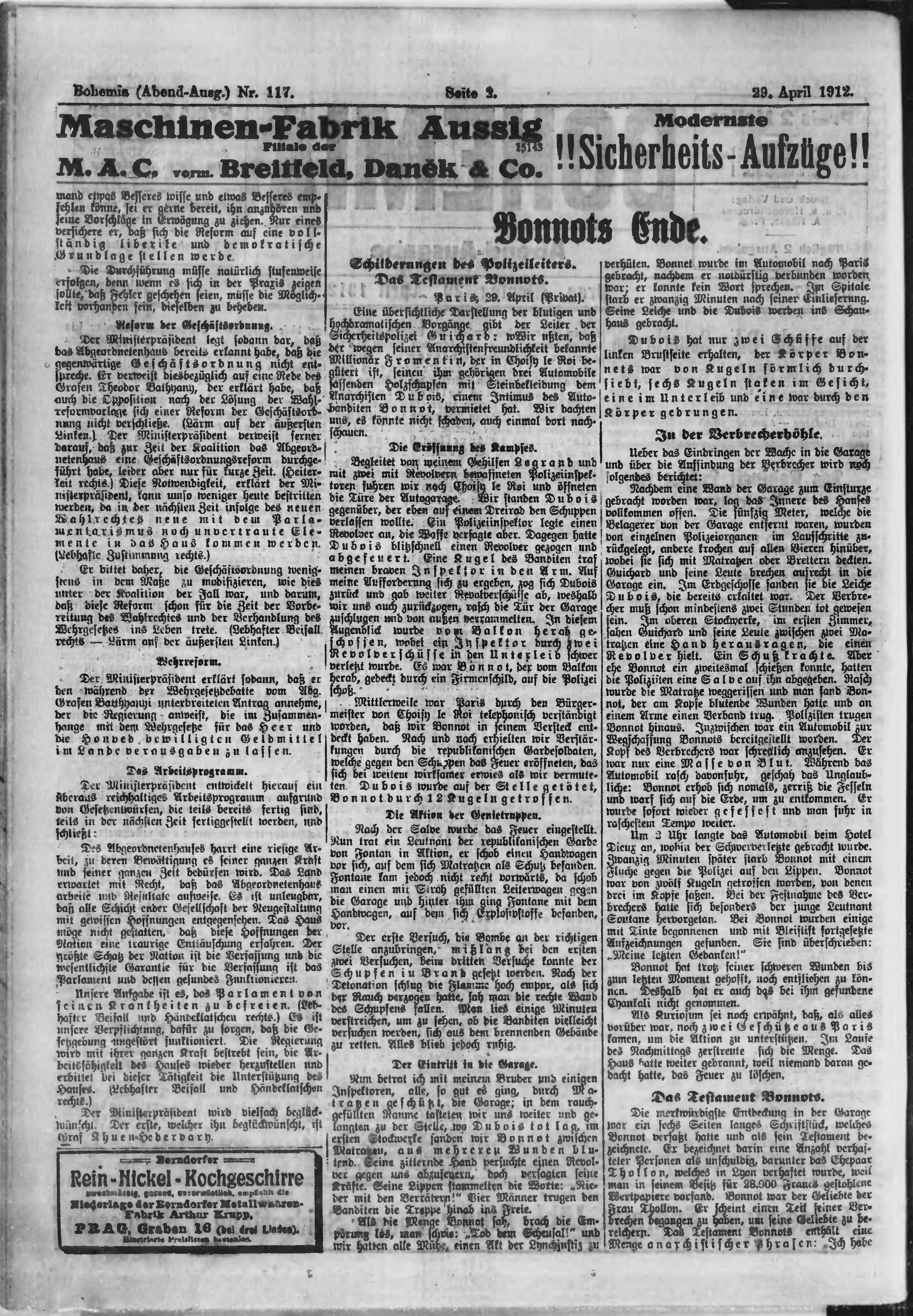 * Datum vydání výtisku: 29.4.1912 Číslo výtisku: 117 Poznámky k výtisku: večerní vydání