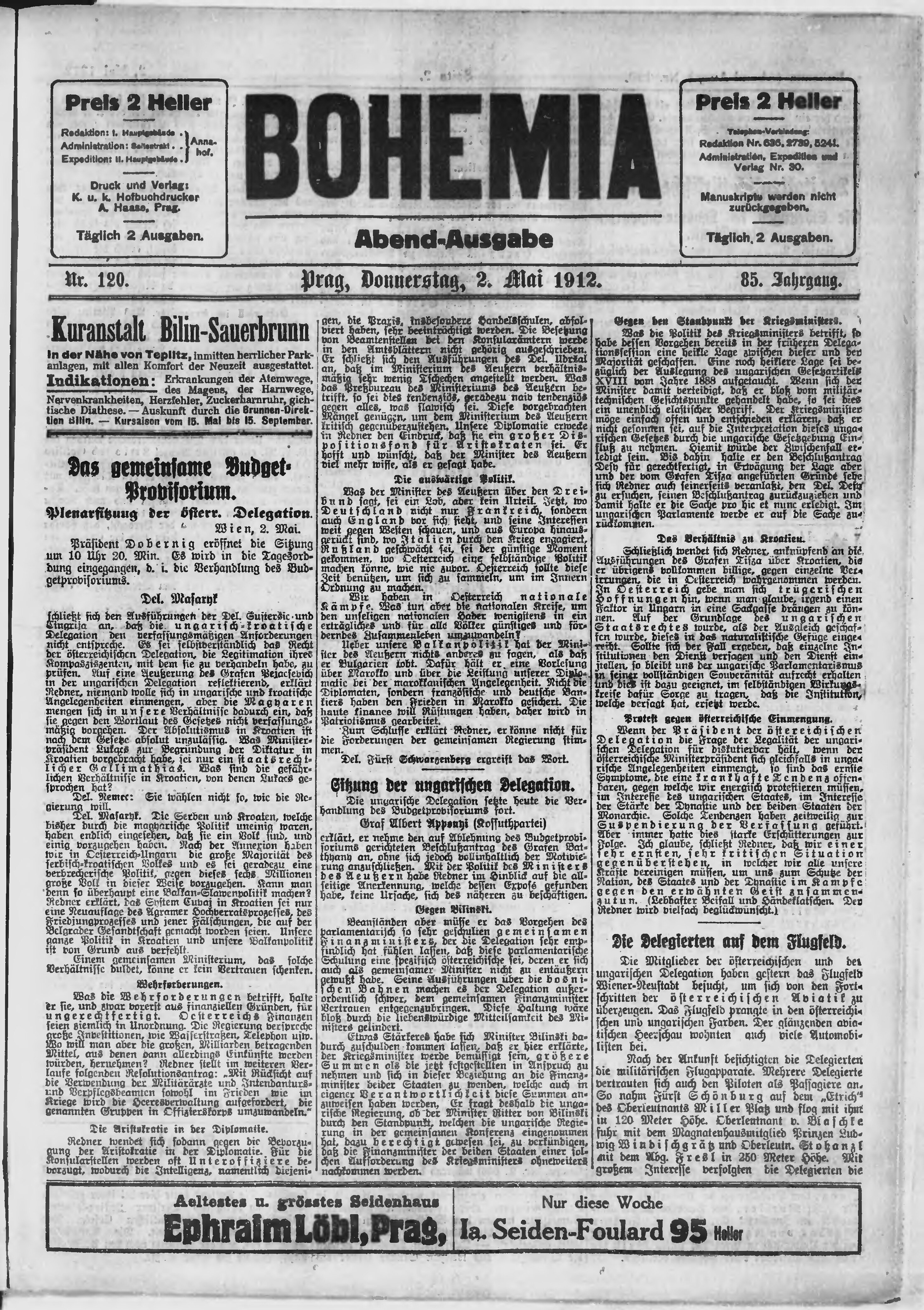 * Datum vydání výtisku: 2.5.1912 Číslo výtisku: 120 Poznámky k výtisku: večerní vydání