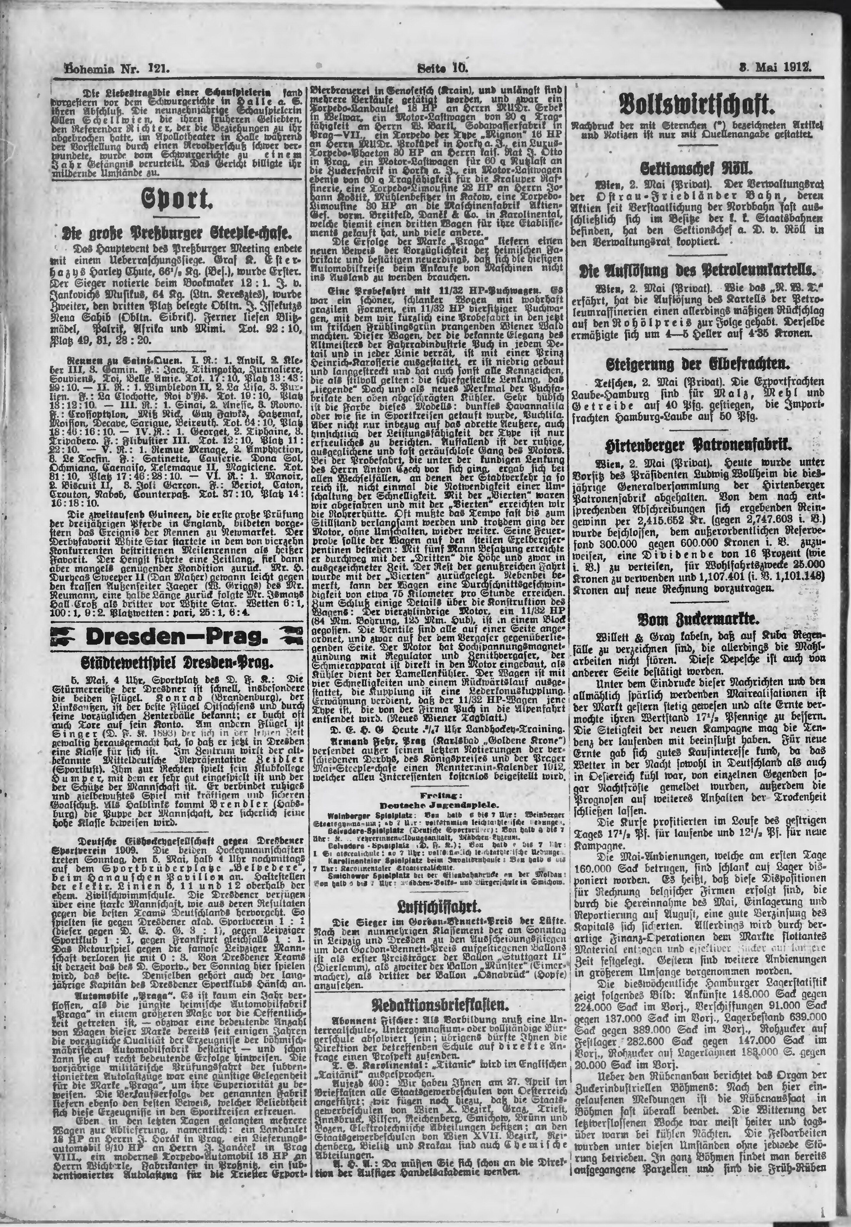 * Datum vydání výtisku: 3.5.1912 Číslo výtisku: 121 Poznámky k výtisku: ranní vydání;
