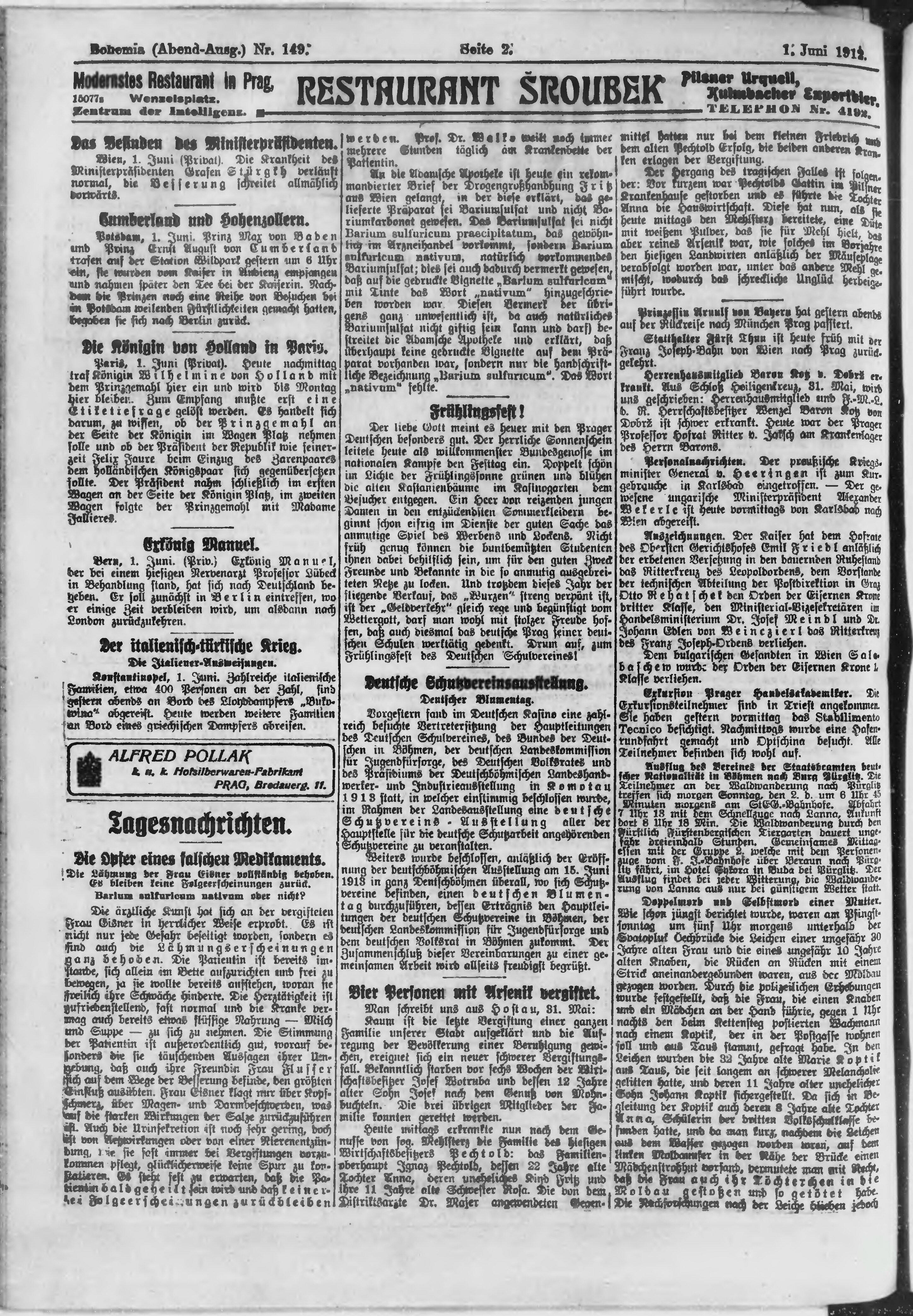 * Datum vydání výtisku: 1.6.1912 Číslo výtisku: 149 Poznámky k výtisku: večerní vydání