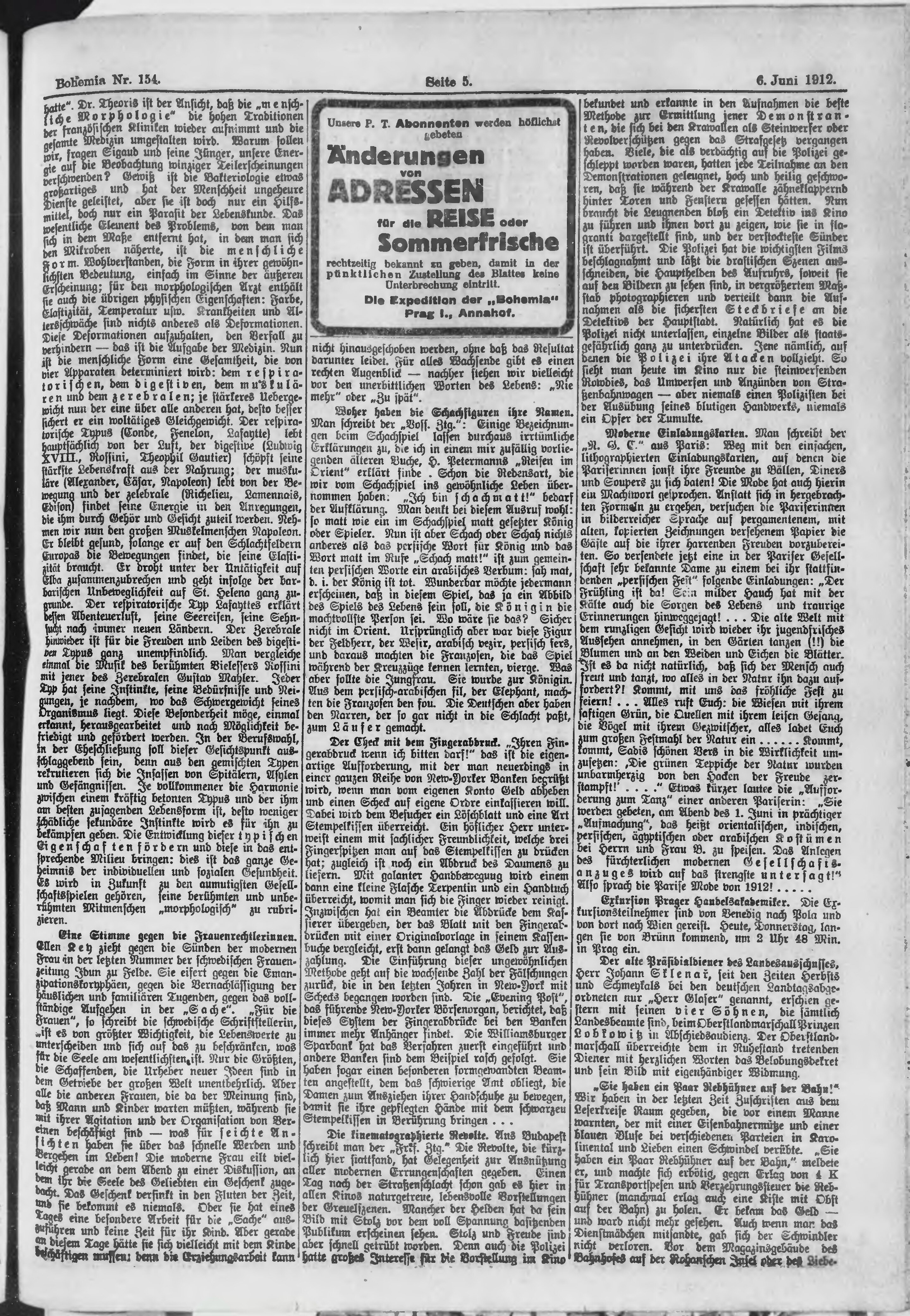 * Datum vydání výtisku: 6.6.1912 Číslo výtisku: 154 Poznámky k výtisku: ranní vydání;