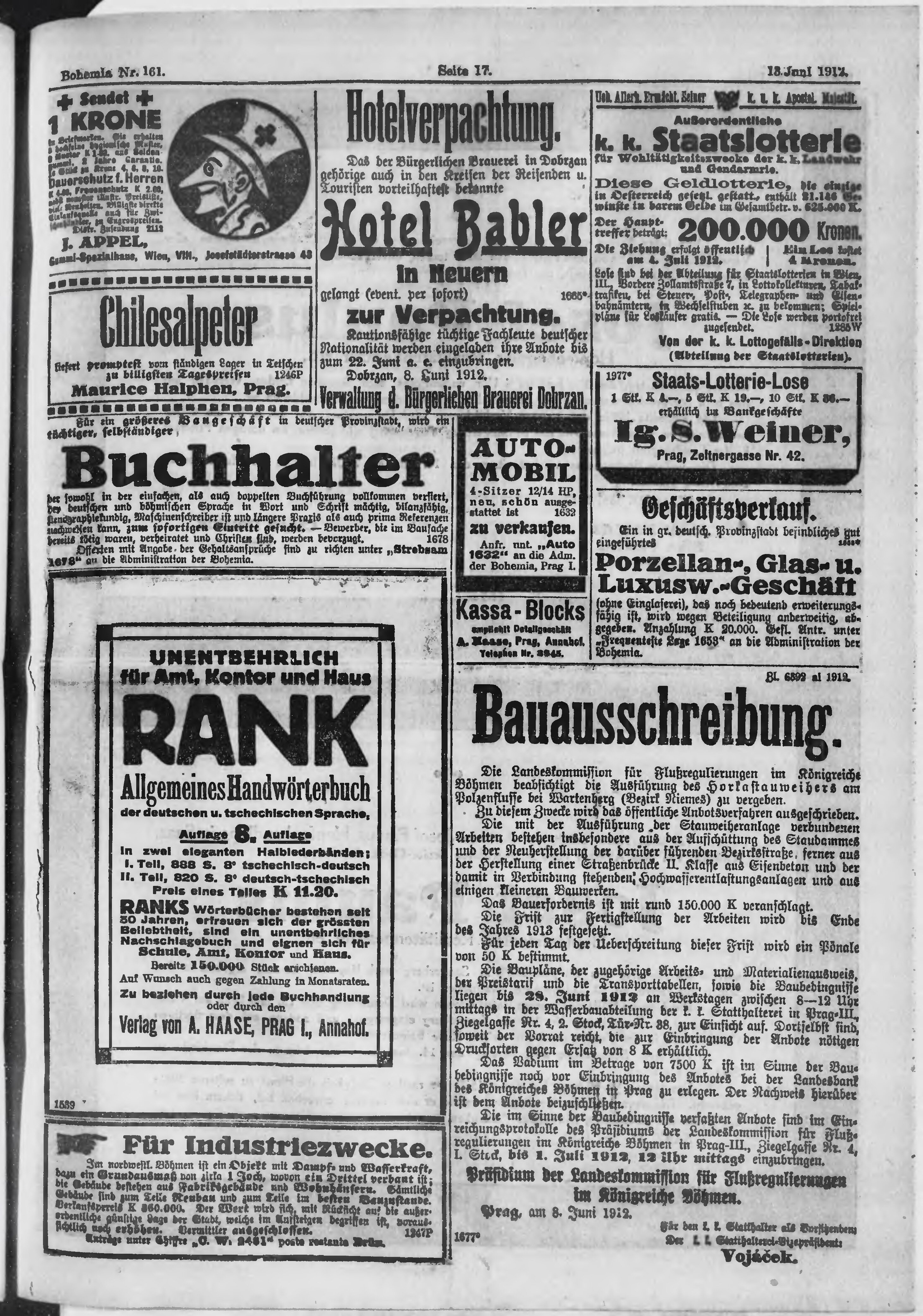 * Datum vydání výtisku: 13.6.1912 Číslo výtisku: 161 Poznámky k výtisku: ranní vydání;
