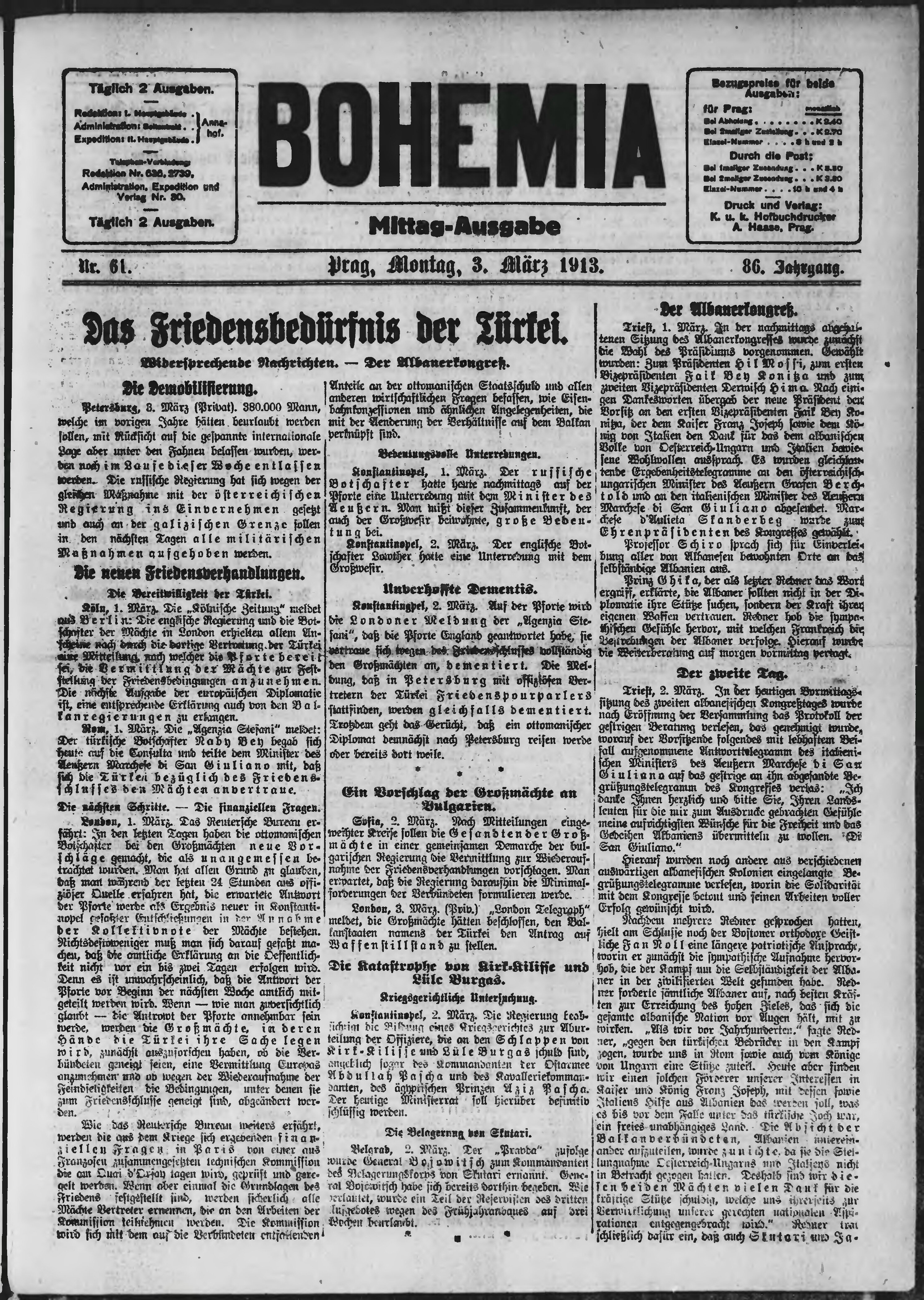 * Datum vydání výtisku: 3.3.1913 Číslo výtisku: 61 Poznámky k výtisku: polední vydání;