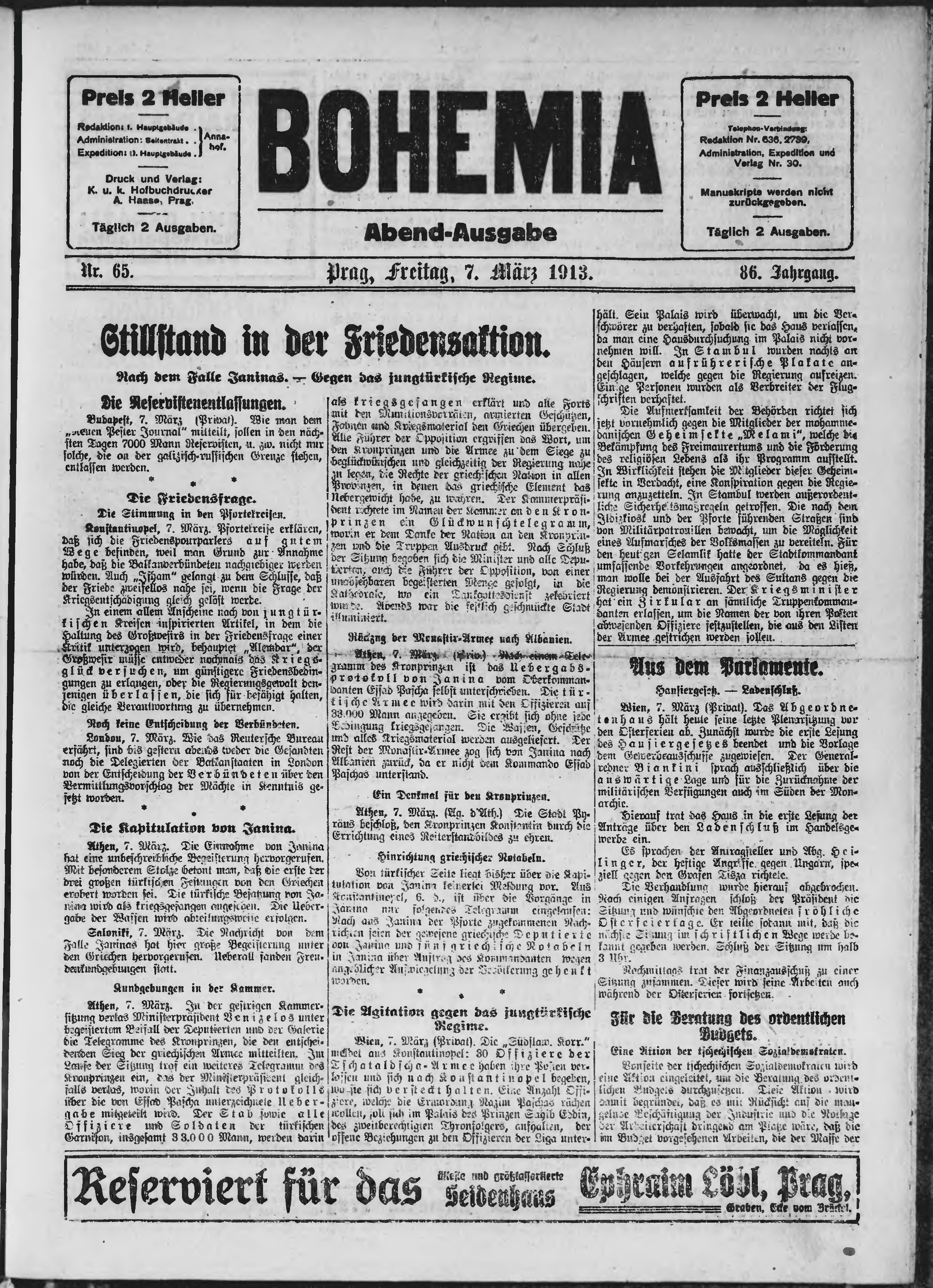 * Datum vydání výtisku: 7.3.1913 Číslo výtisku: 65 Poznámky k výtisku: večerní vydání
