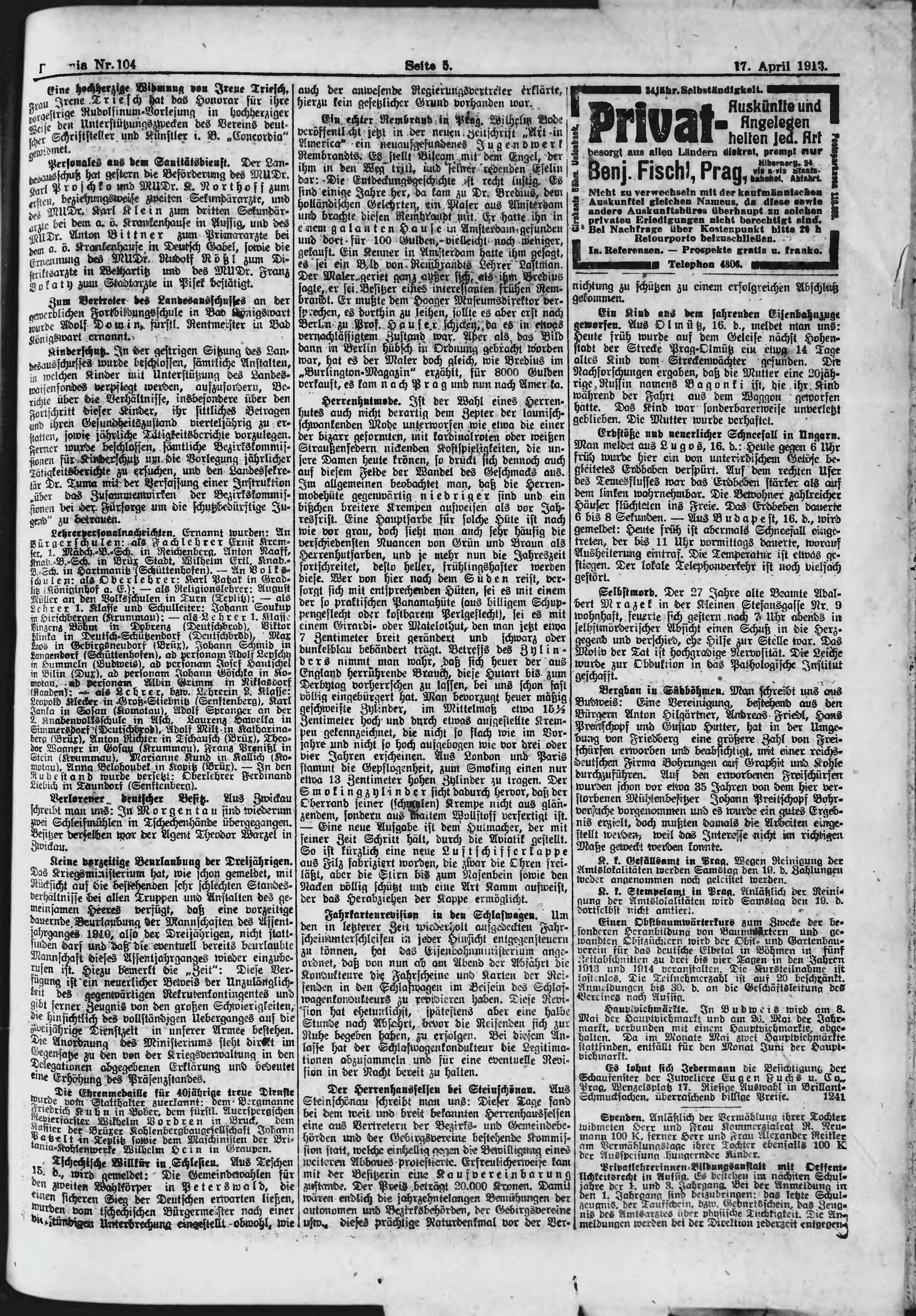 * Datum vydání výtisku: 17.4.1913 Číslo výtisku: 104 Poznámky k výtisku: ranní vydání;