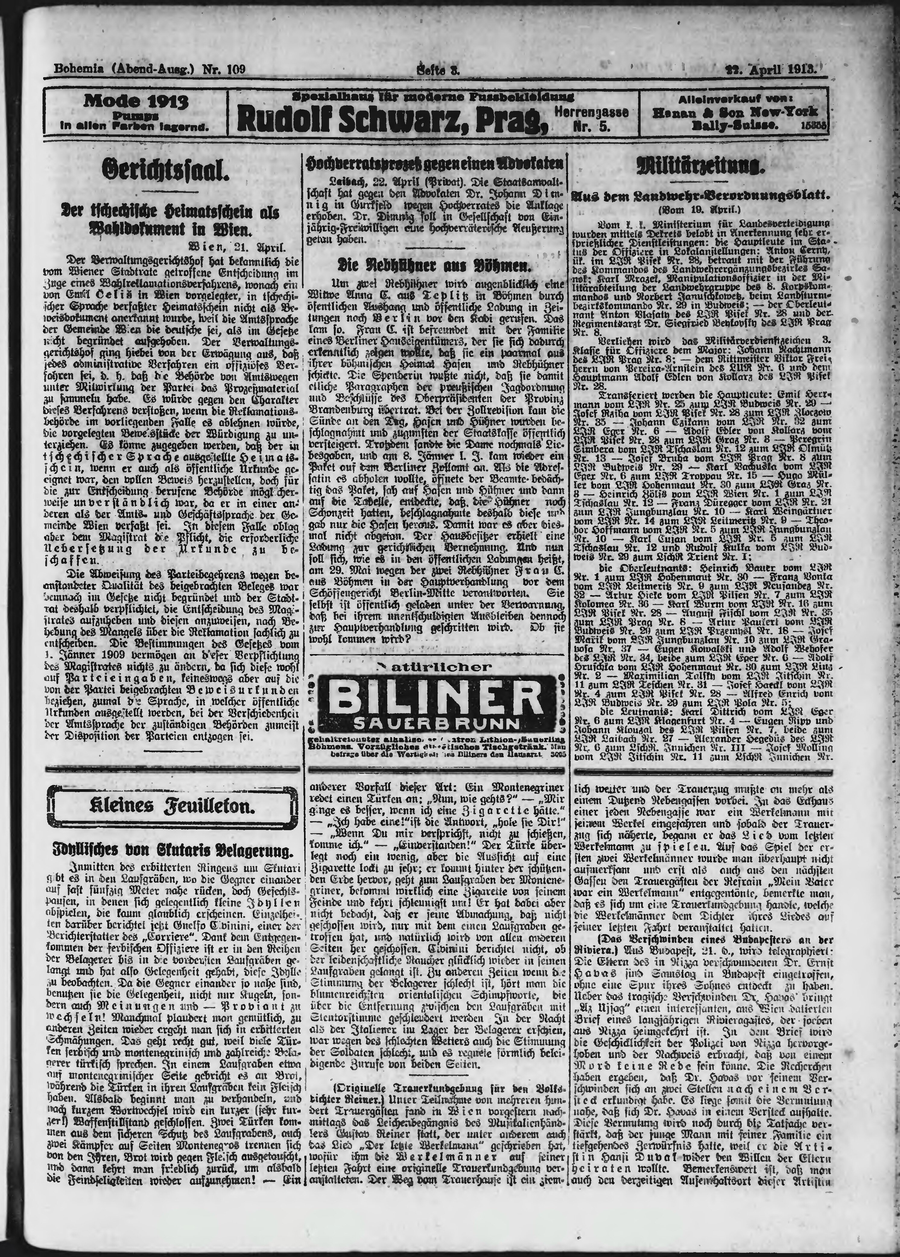 * Datum vydání výtisku: 22.4.1913 Číslo výtisku: 109 Poznámky k výtisku: večerní vydání