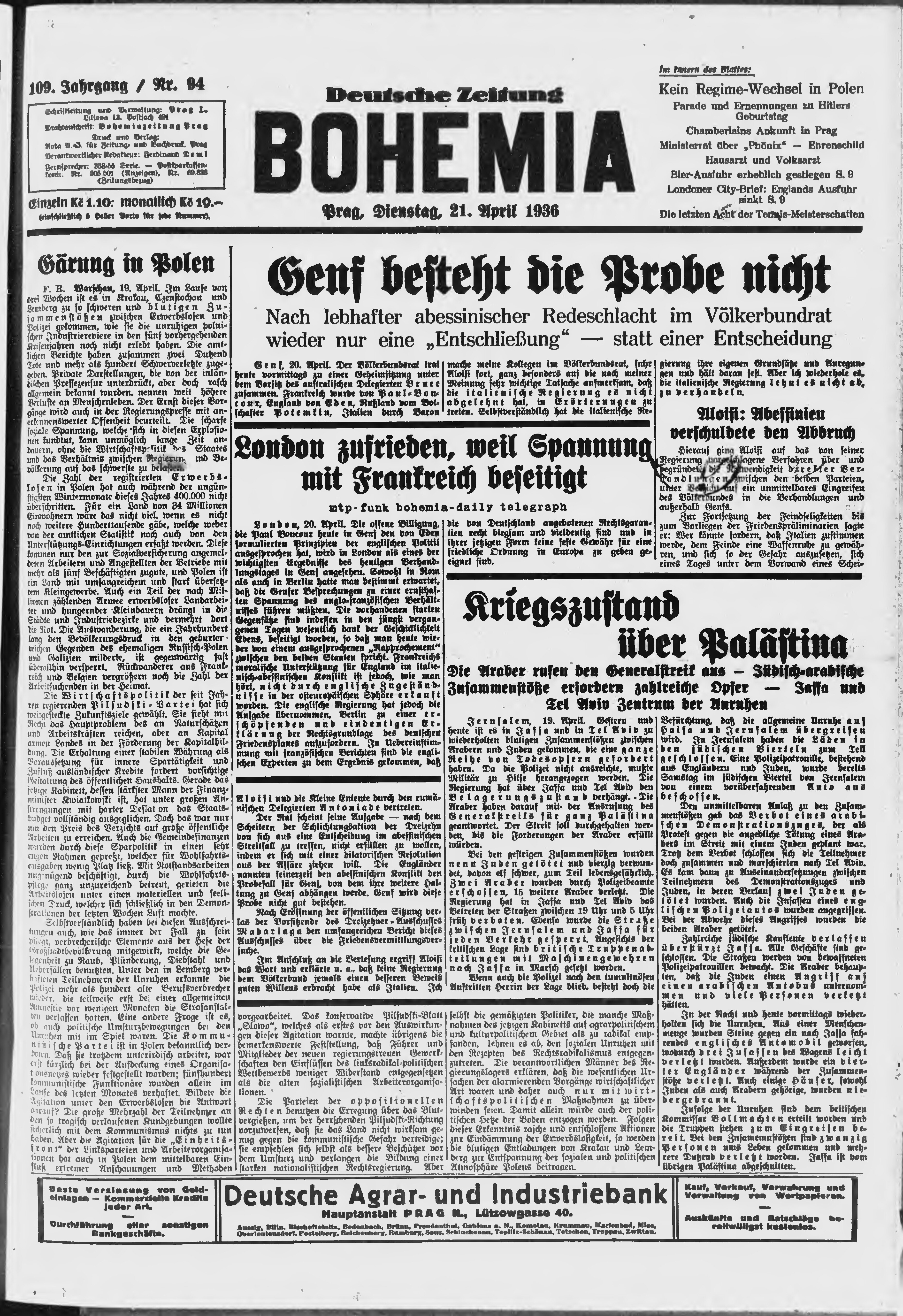 * Datum vydání výtisku: 21.4.1936 Číslo výtisku: 94 Poznámky k výtisku: ranní vydání;