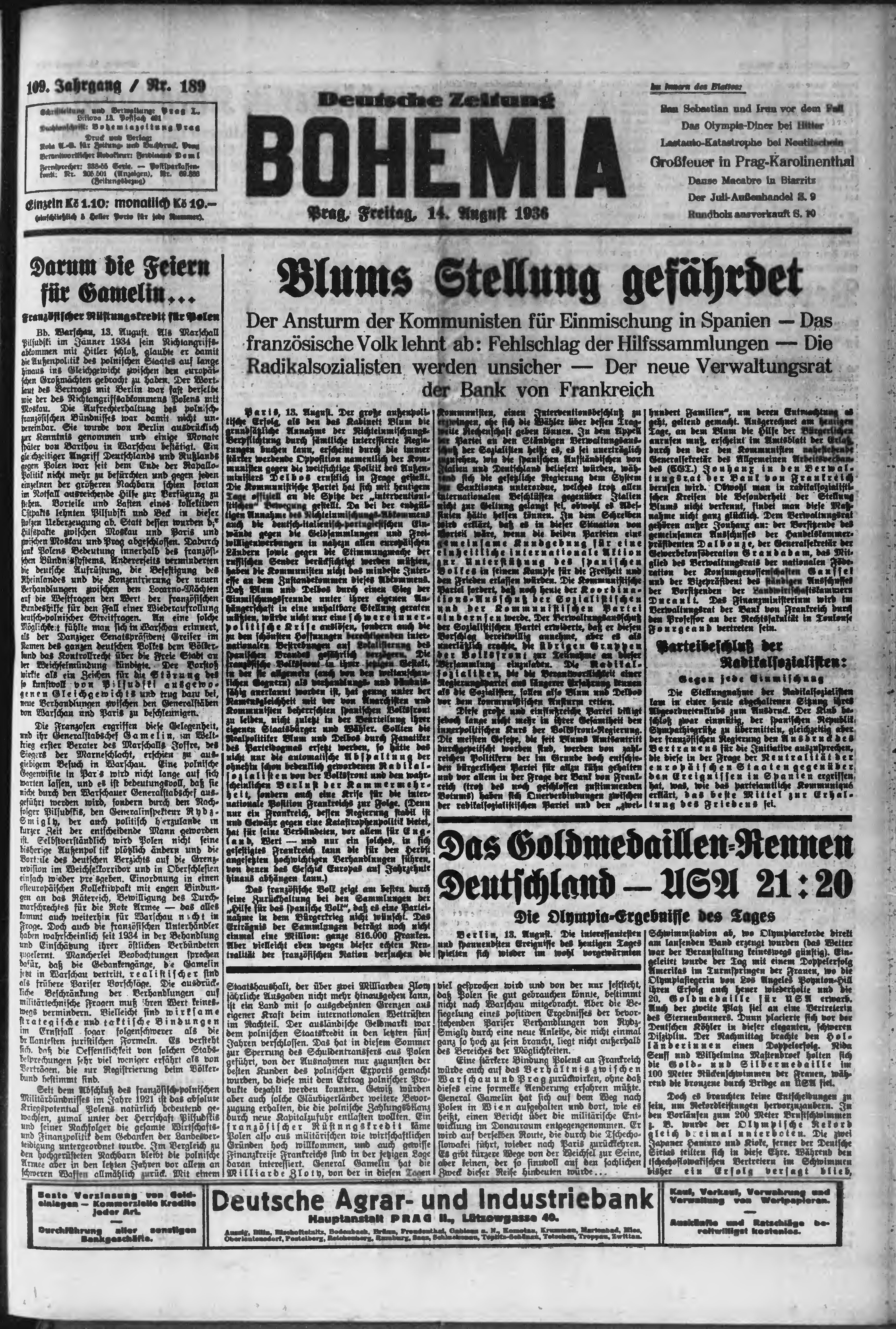 * Datum vydání výtisku: 14.8.1936 Číslo výtisku: 189 Poznámky k výtisku: ranní vydání;