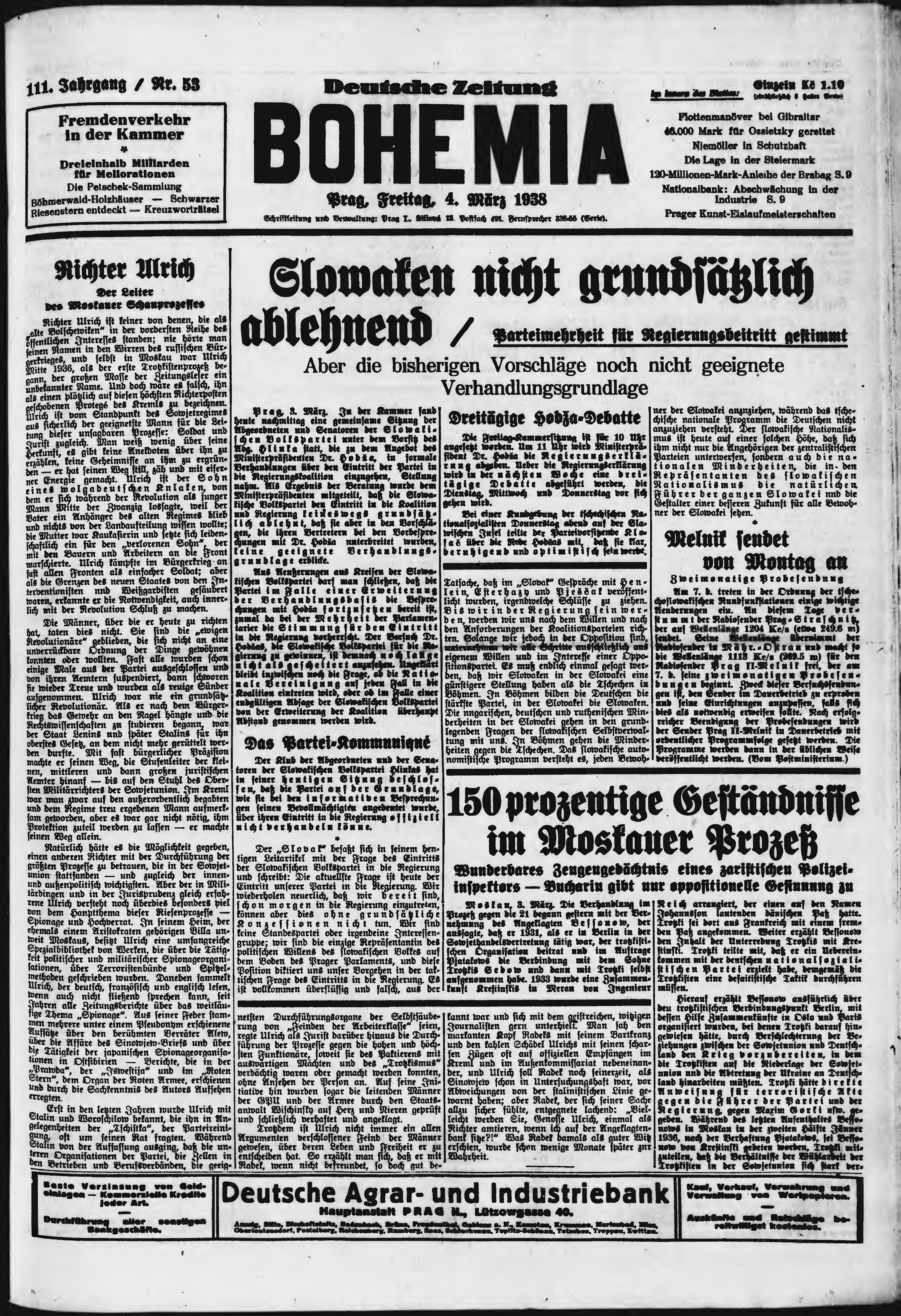 * Datum vydání výtisku: 4.3.1938 Číslo výtisku: 53 Poznámky k výtisku: ranní vydání;