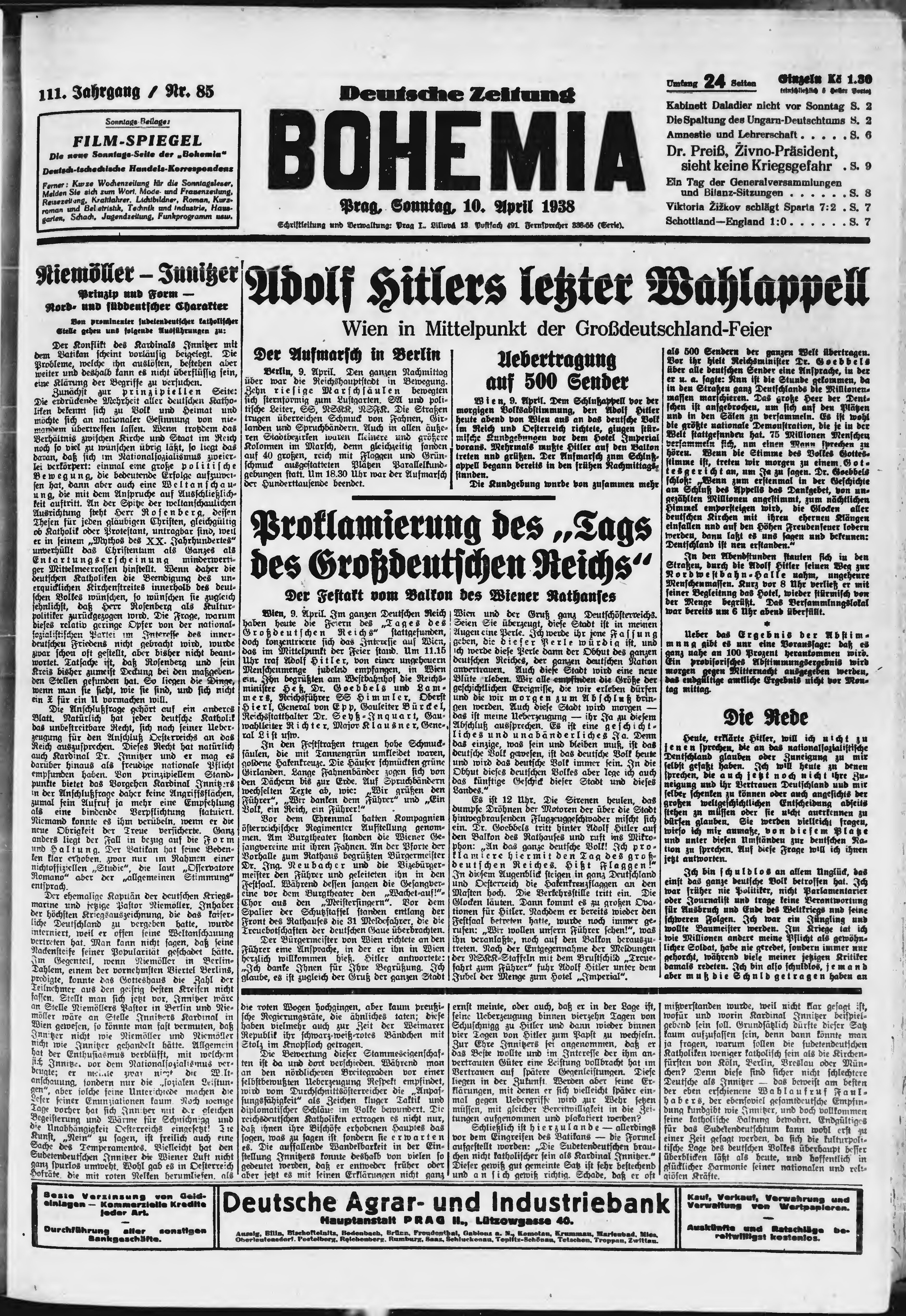* Datum vydání výtisku: 10.4.1938 Číslo výtisku: 85 Poznámky k výtisku: ranní vydání;