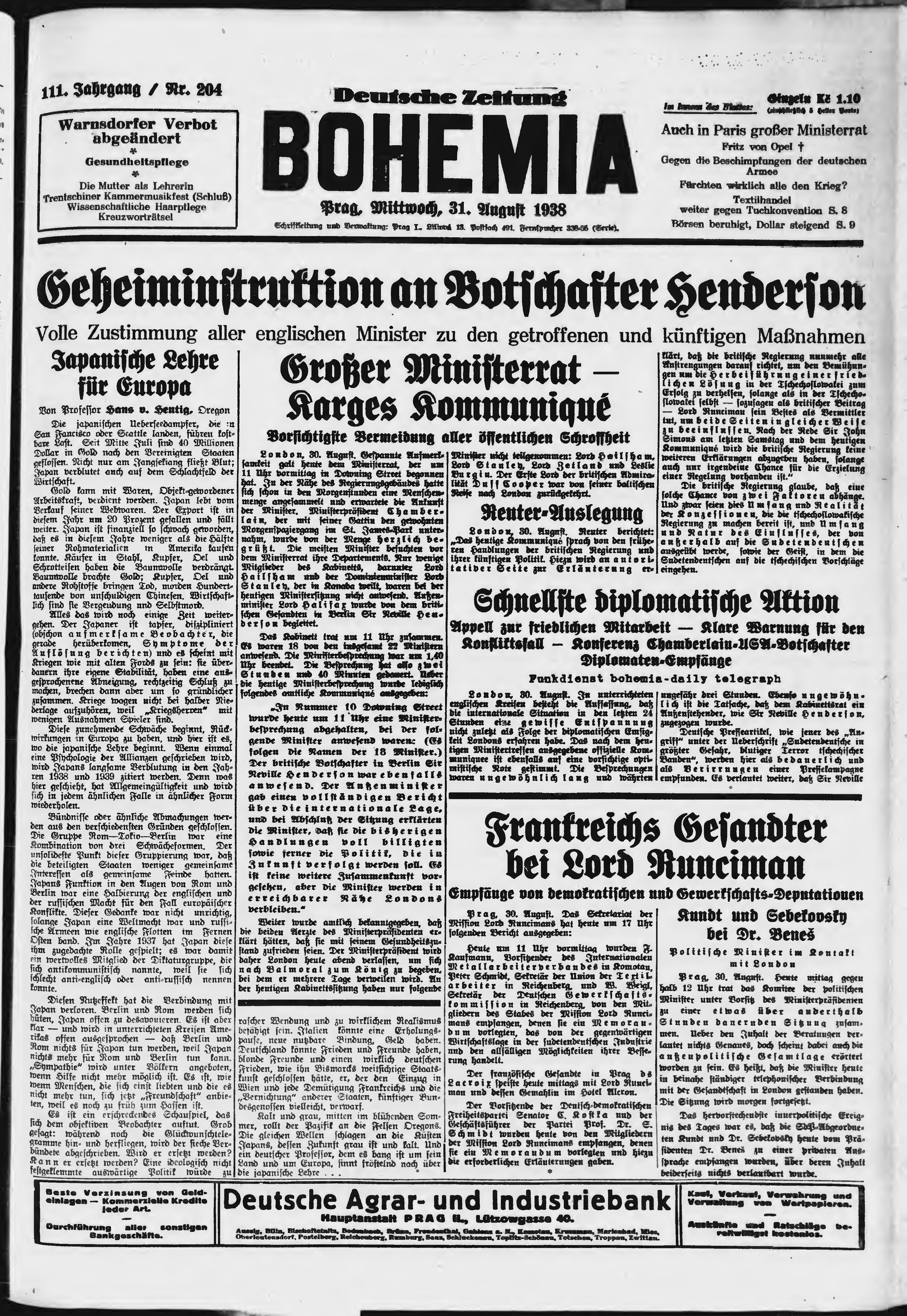 * Datum vydání výtisku: 31.8.1938 Číslo výtisku: 204 Poznámky k výtisku: ranní vydání;