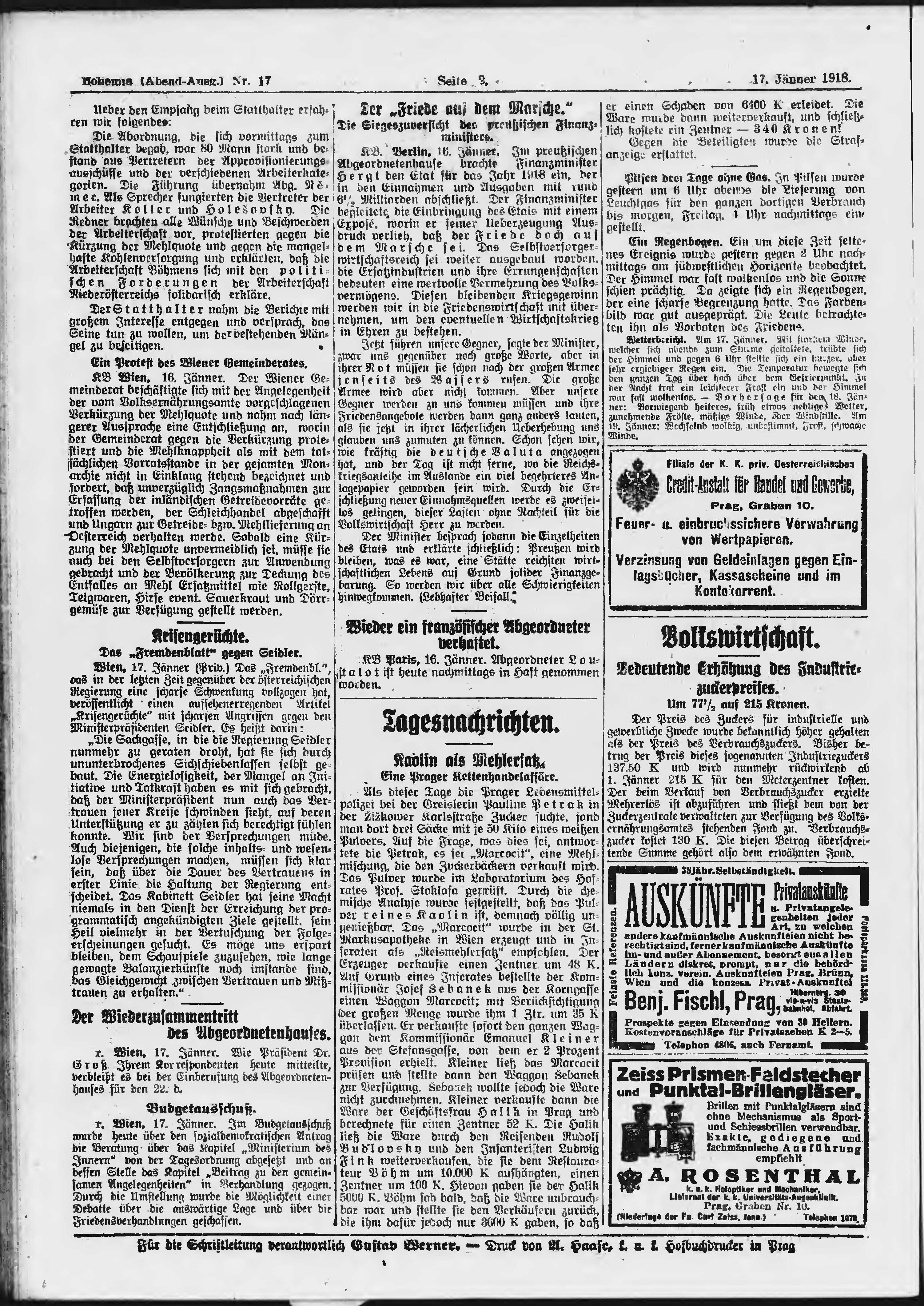 * Datum vydání výtisku: 17.1.1918 Číslo výtisku: 17 Poznámky k výtisku: večerní vydání;