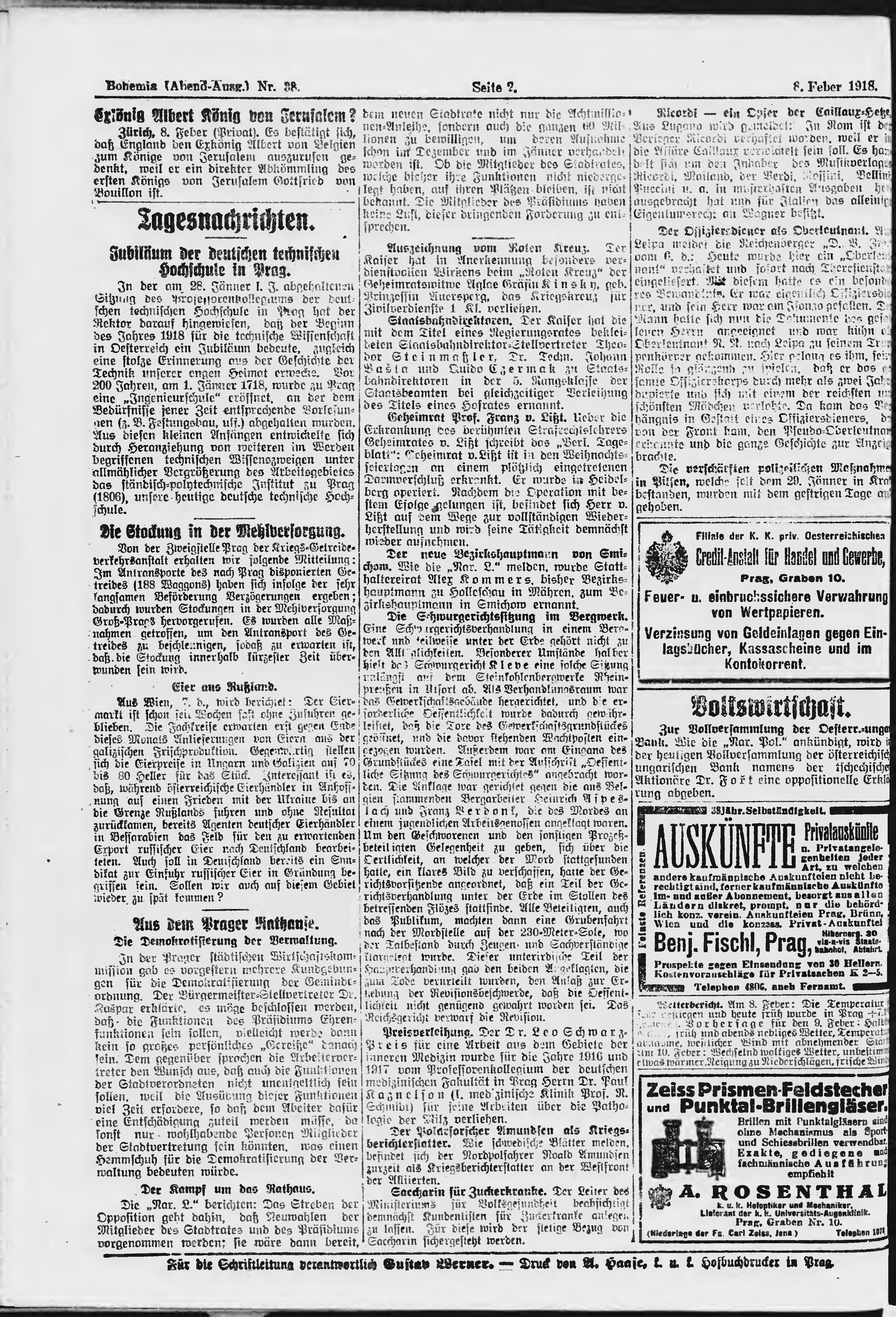 * Datum vydání výtisku: 8.2.1918 Číslo výtisku: 38 Poznámky k výtisku: večerní vydání; chybný údaj v číslování výtisku;