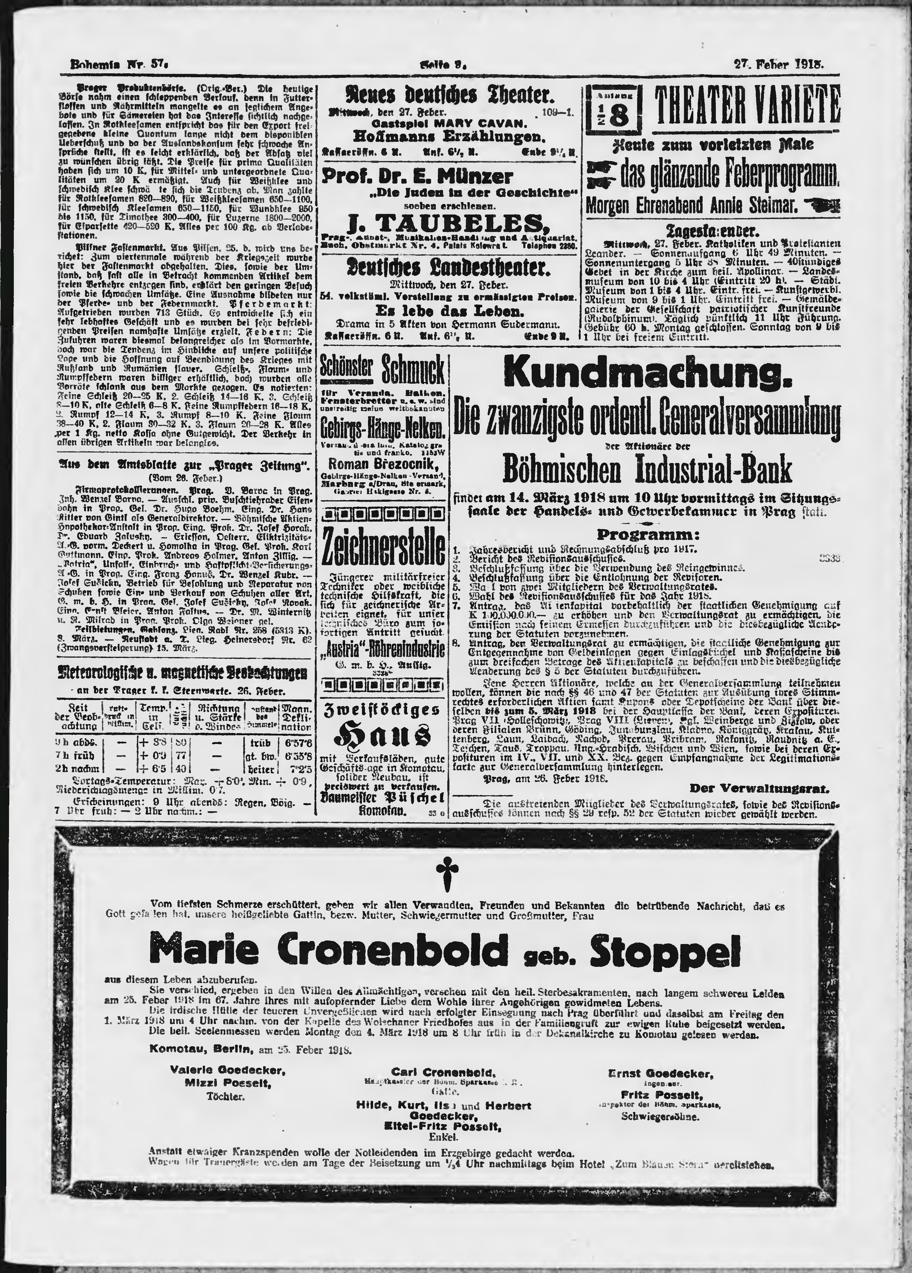 * Datum vydání výtisku: 27.2.1918 Číslo výtisku: 57 Poznámky k výtisku: ranní vydání;