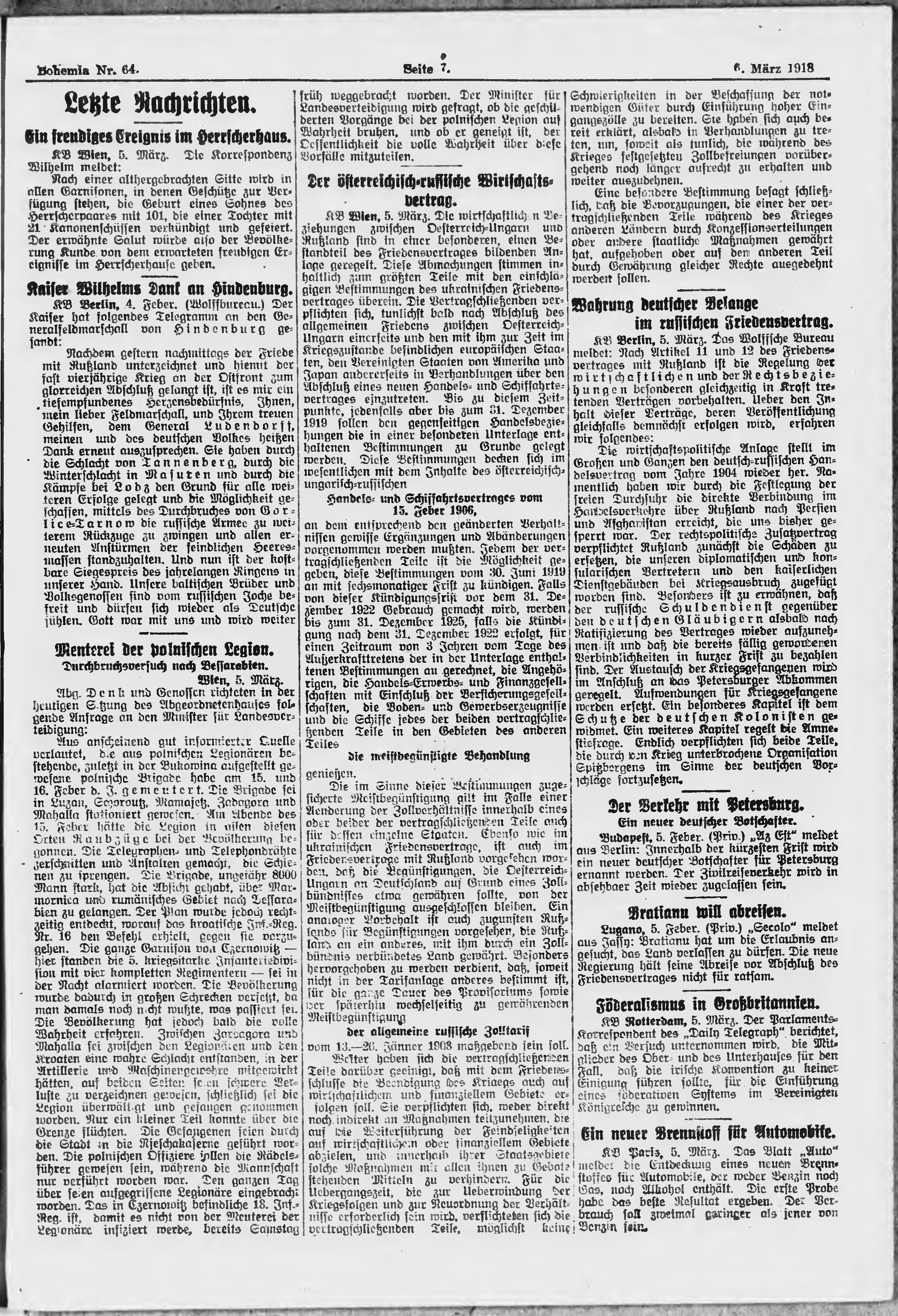 * Datum vydání výtisku: 6.3.1918 Číslo výtisku: 64 Poznámky k výtisku: ranní vydání;
